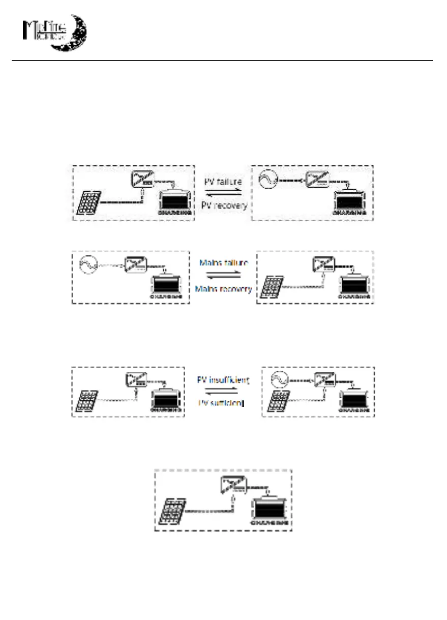 1) PV priority: PV module will charge the battery preferentially, and the battery is charged by the