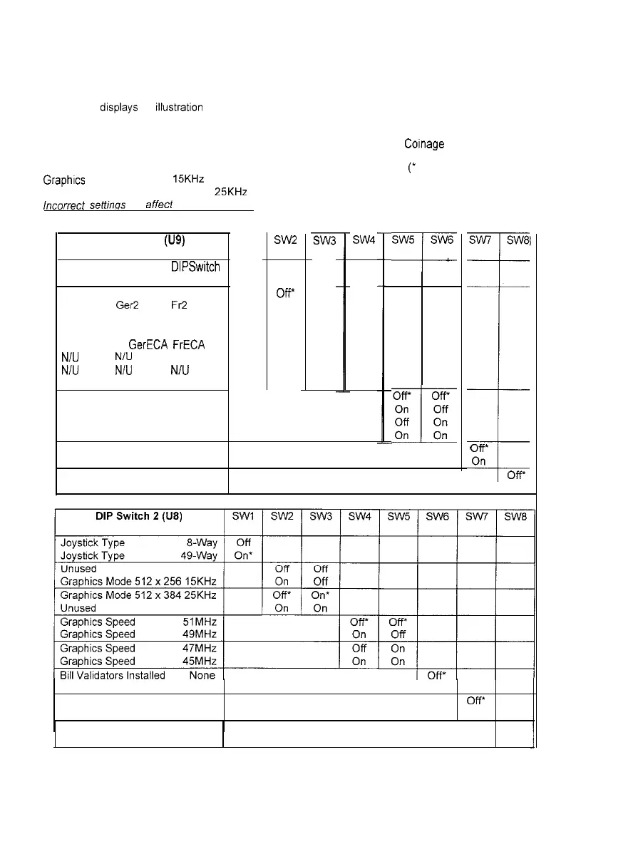 DIP-switches may be changed with the power on. Set any switch, then check the screen to verify that the
