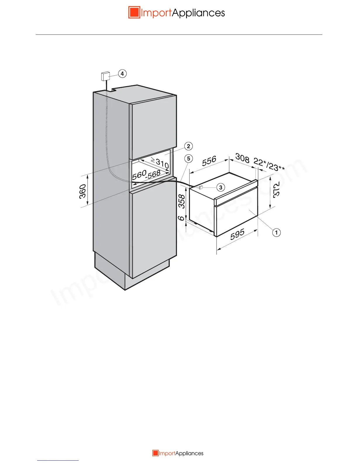 Recommended position for electrical socket. Important: do not position behind