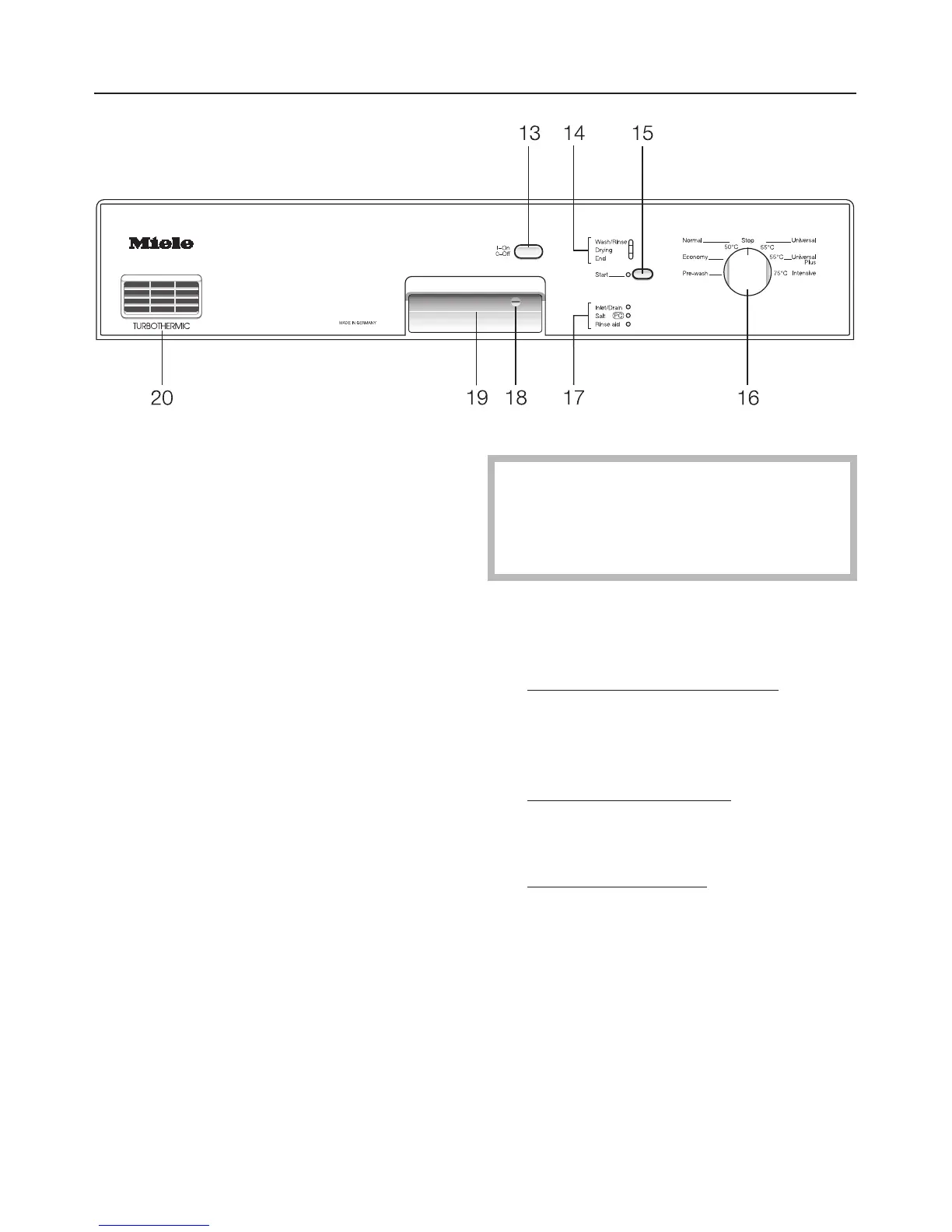 "Start" (15) and "Wash/Rinse" (14) indi