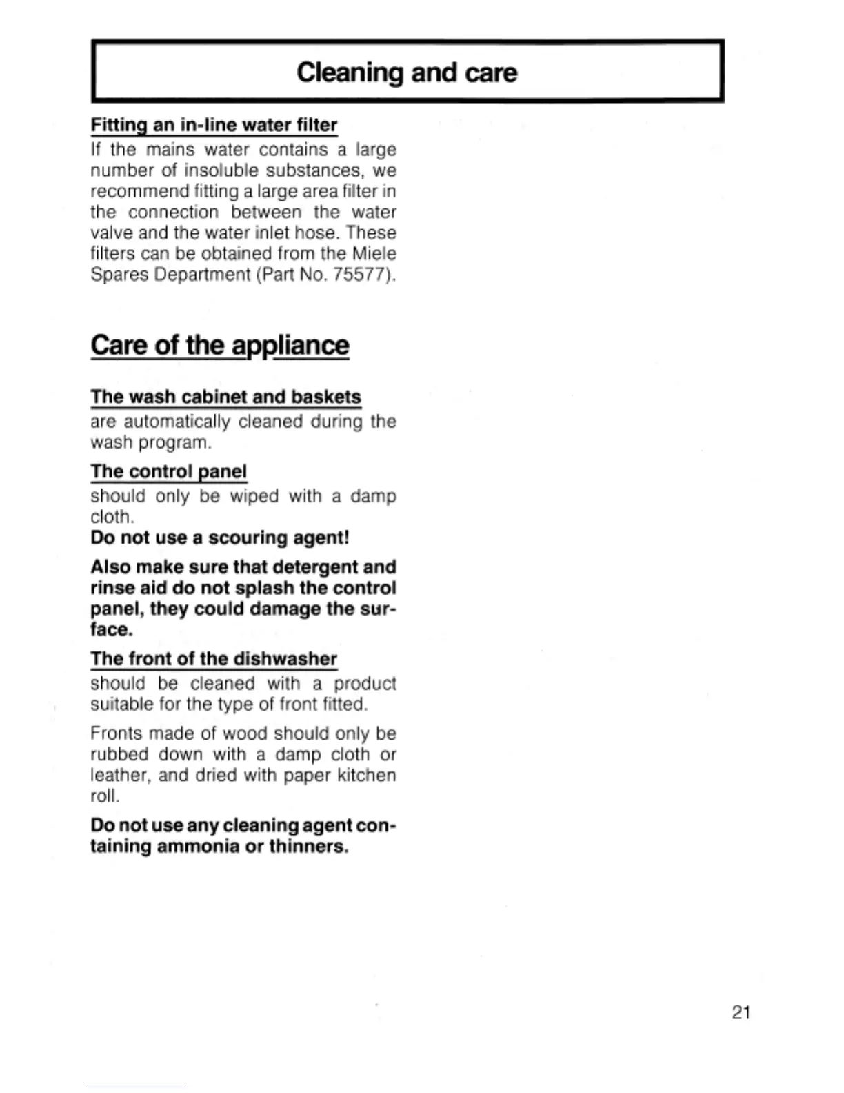 Miele G 522 U - Care of the Appliance; Fitting an In-Line Water Filter; The Wash Cabinet and Baskets; The Control Panel
