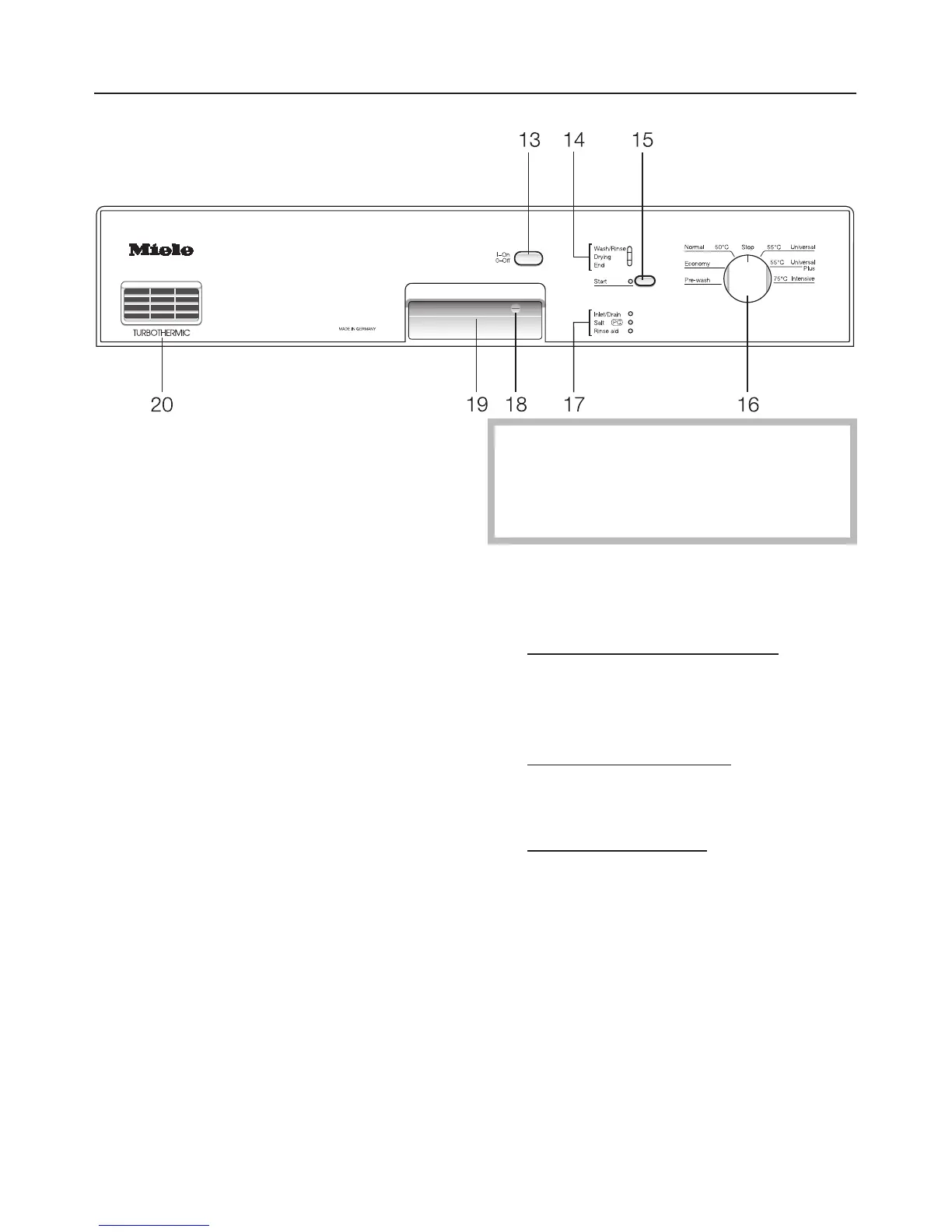 "Start" (15) and "Wash/Rinse" (14) indi