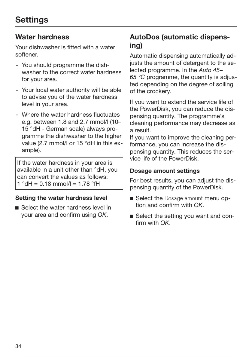 Miele G 7360 - Water Hardness; Autodos (Automatic Dispensing)