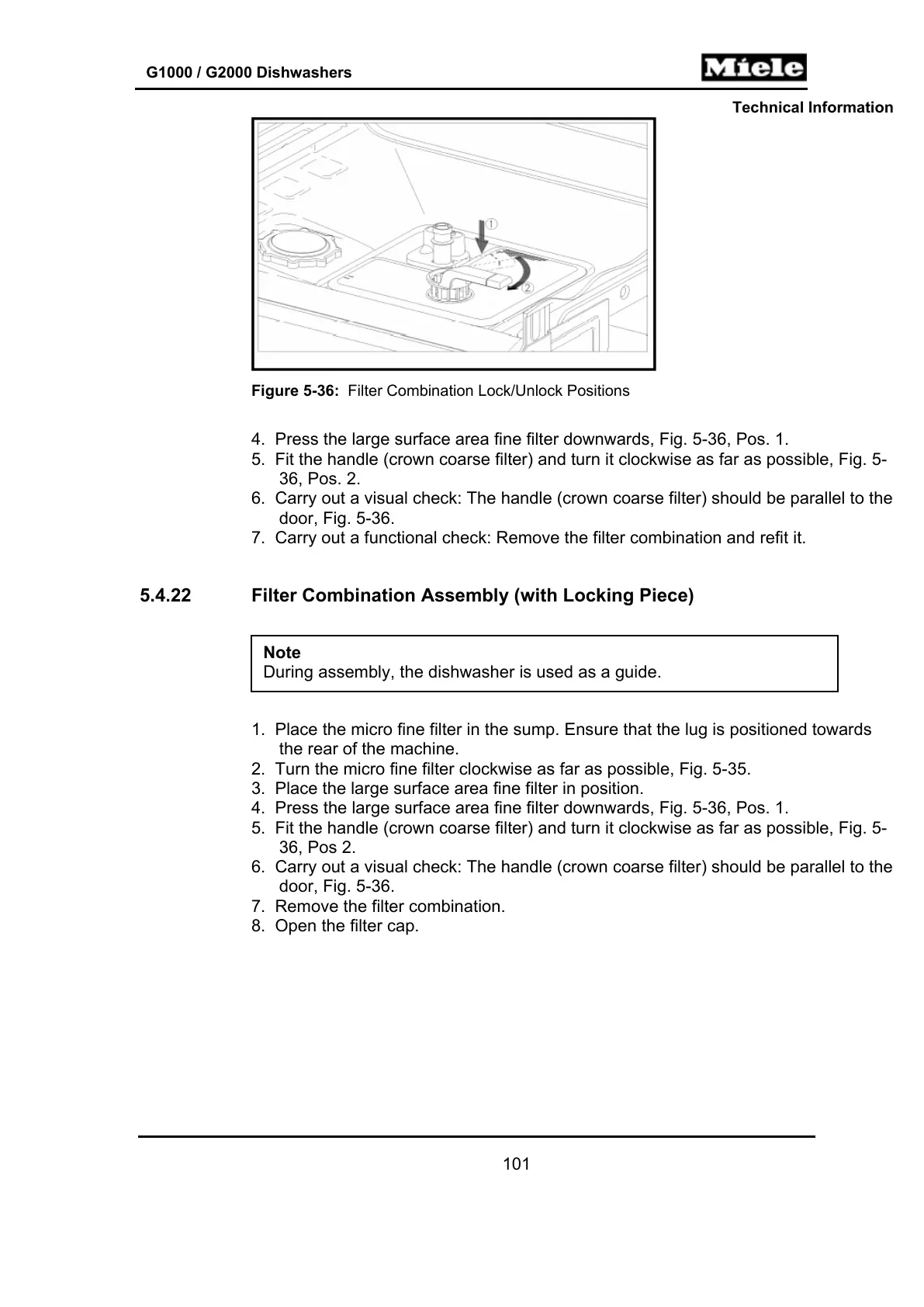 4. Press the large surface area fine filter downwards, Fig. 5-36, Pos. 1.