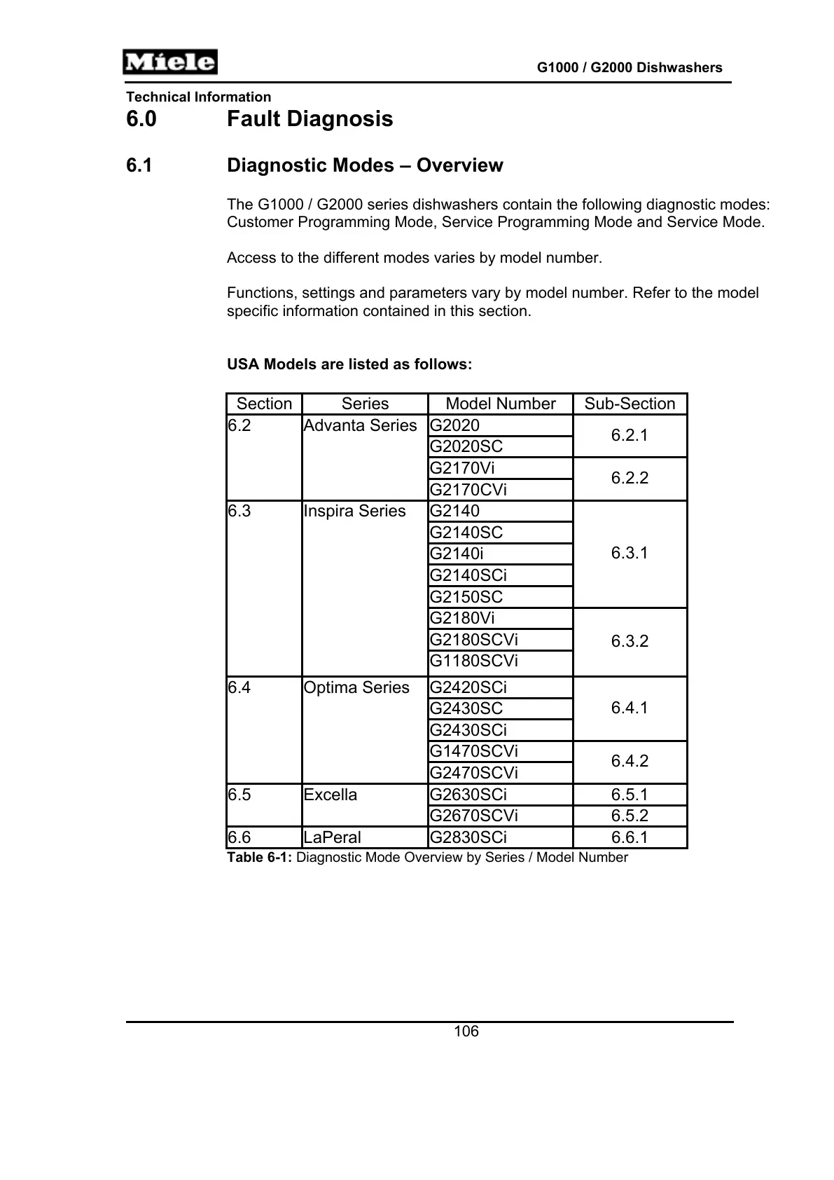 Table 6-1: Diagnostic Mode Overview by Series / Model Number