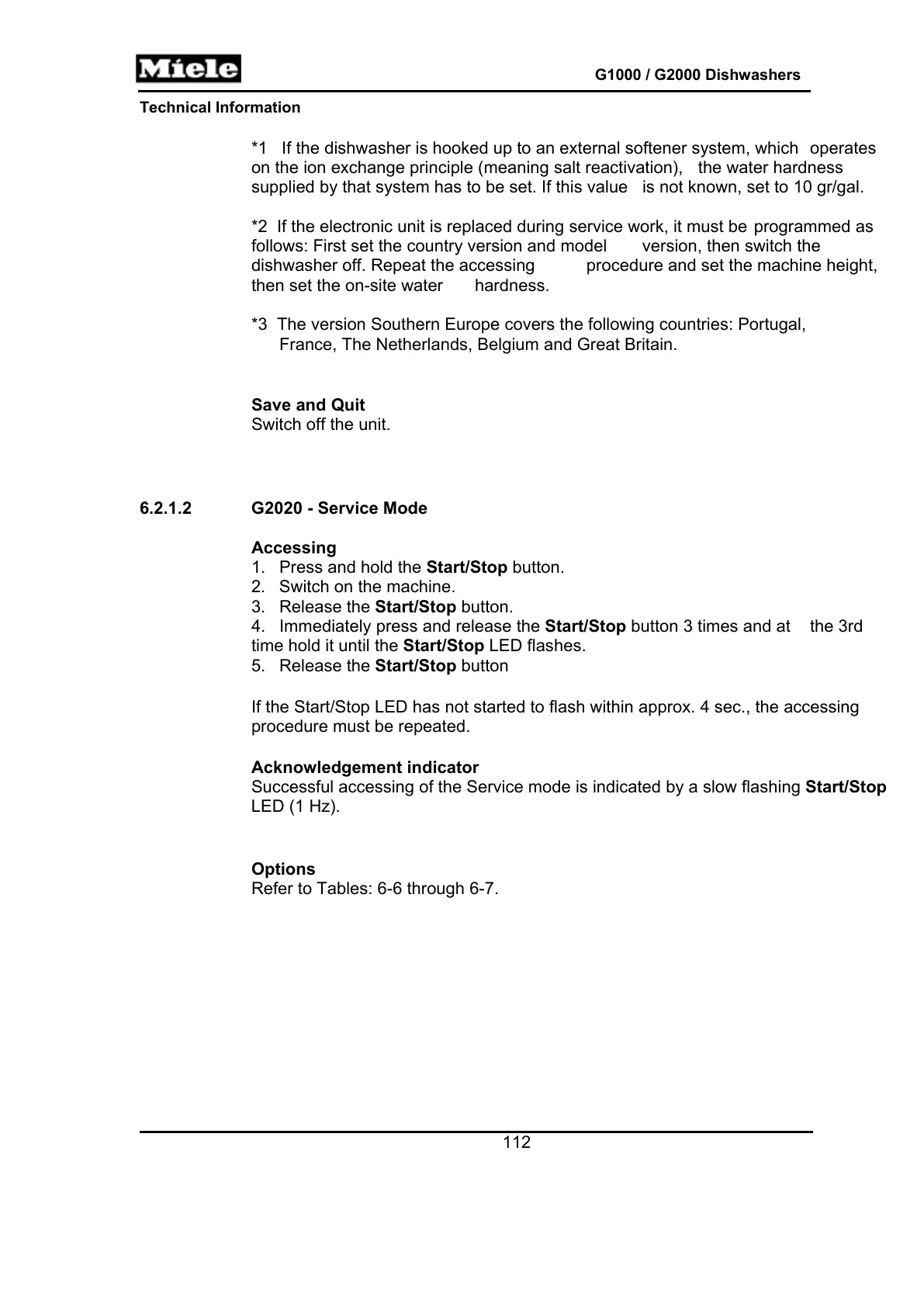 Successful accessing of the Service mode is indicated by a slow flashing Start/Stop