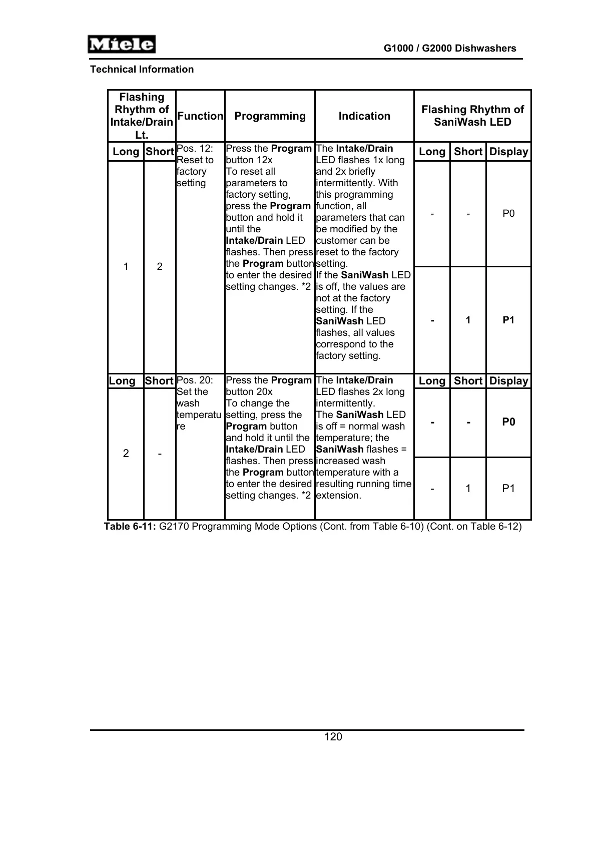 Table 6-11: G2170 Programming Mode Options (Cont. from Table 6-10) (Cont. on Table 6-12)