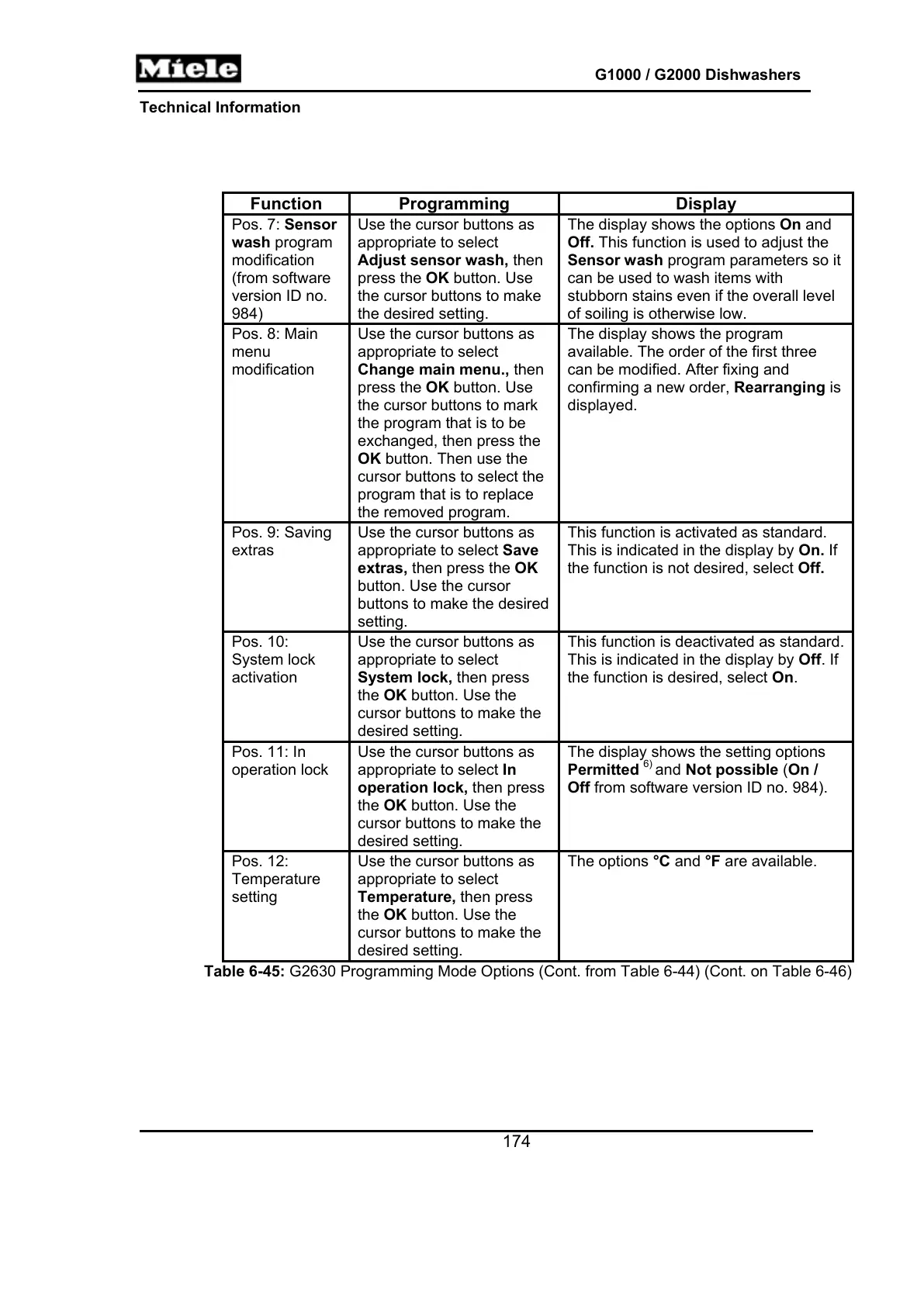 Table 6-45: G2630 Programming Mode Options (Cont. from Table 6-44) (Cont. on Table 6-46)