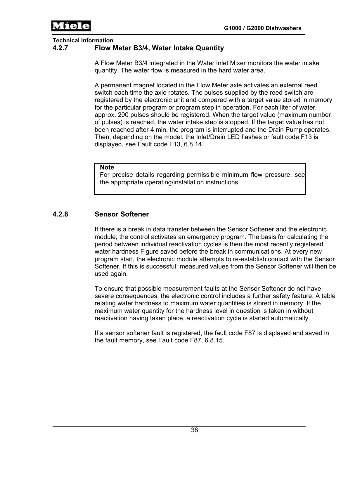 If a sensor softener fault is registered, the fault code F87 is displayed and saved in