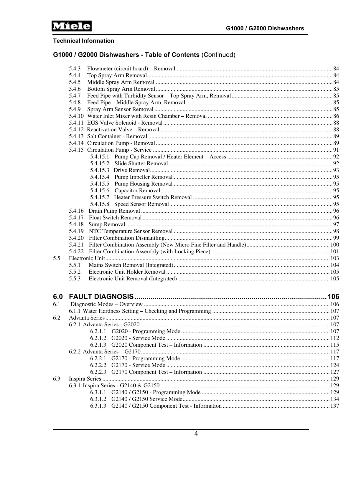 G1000 / G2000 Dishwashers - Table of Contents (Continued)