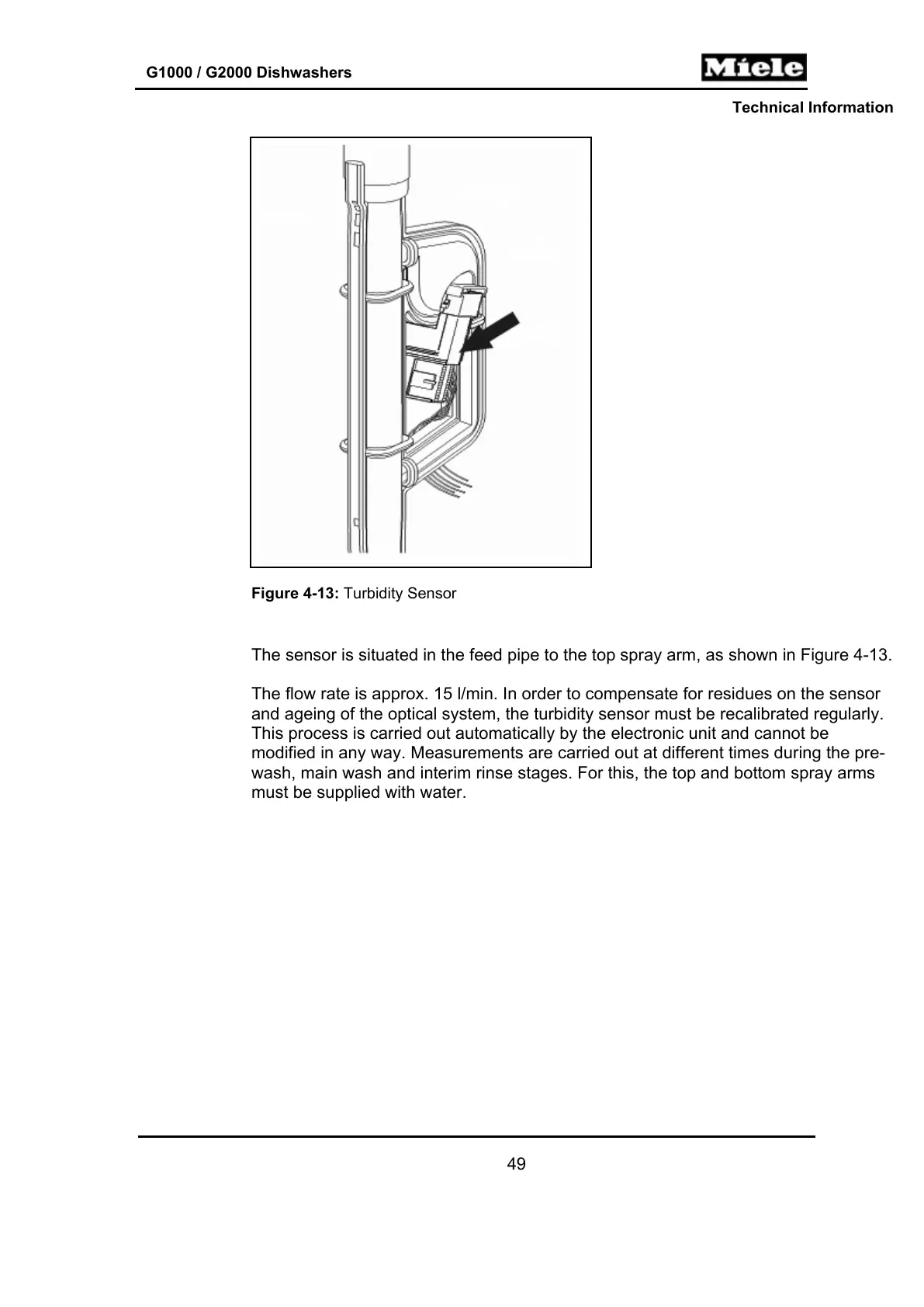 The sensor is situated in the feed pipe to the top spray arm, as shown in Figure 4-13.