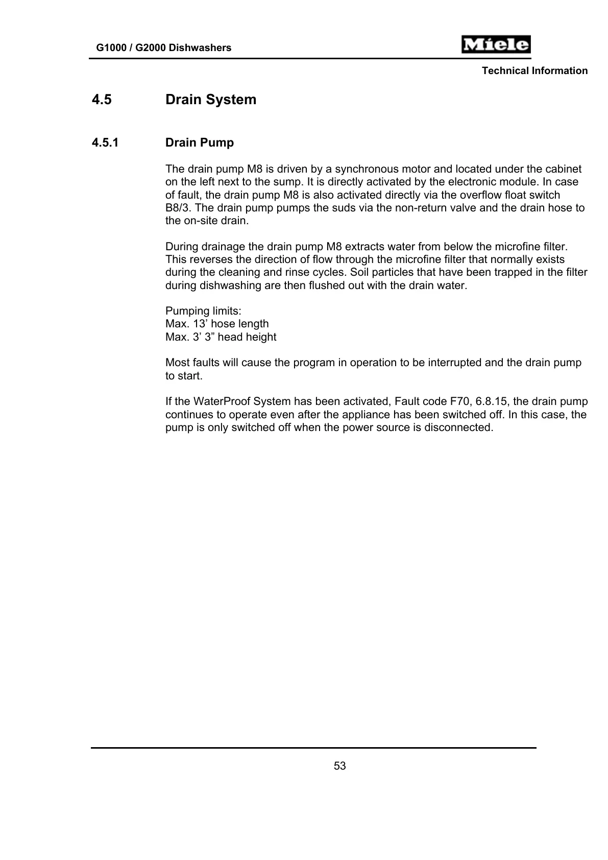 If the WaterProof System has been activated, Fault code F70, 6.8.15, the drain pump