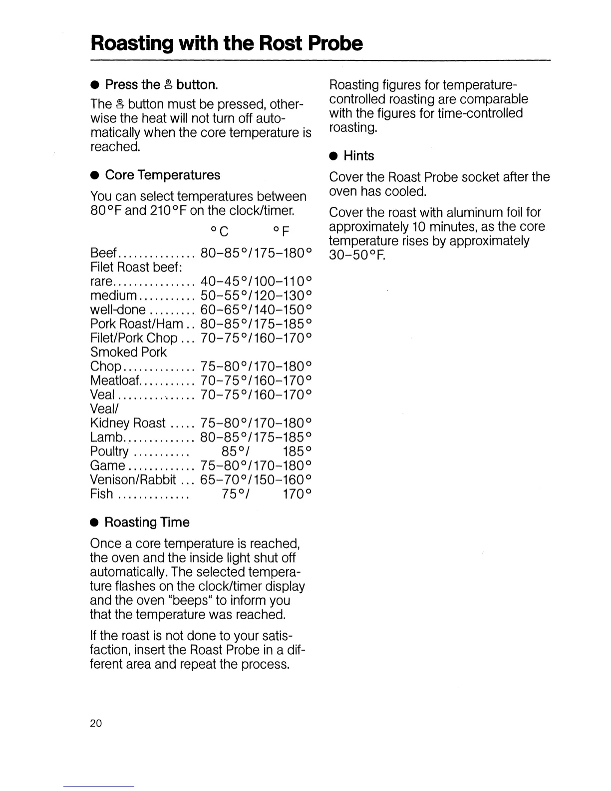Miele H806B2/C - Core Temperature Settings; Roast Probe Operation Hints