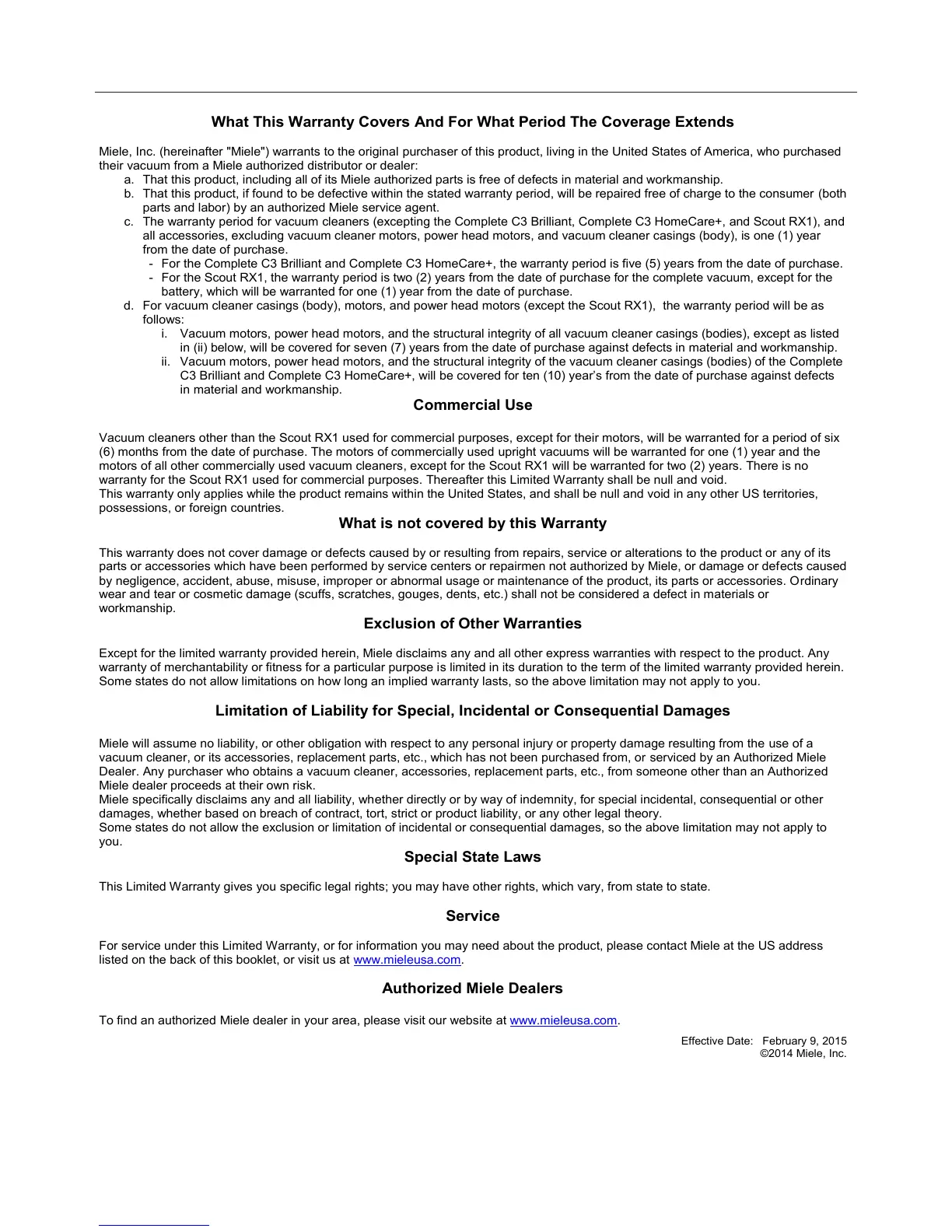 parts and labor) by an authorized Miele service agent.