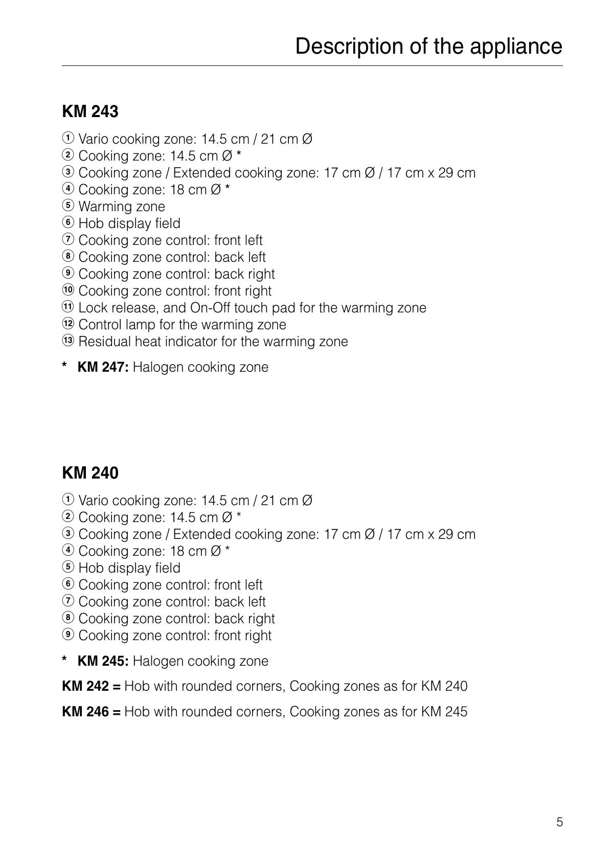 KM 242 = Hob with rounded corners, Cooking zones as for KM 240