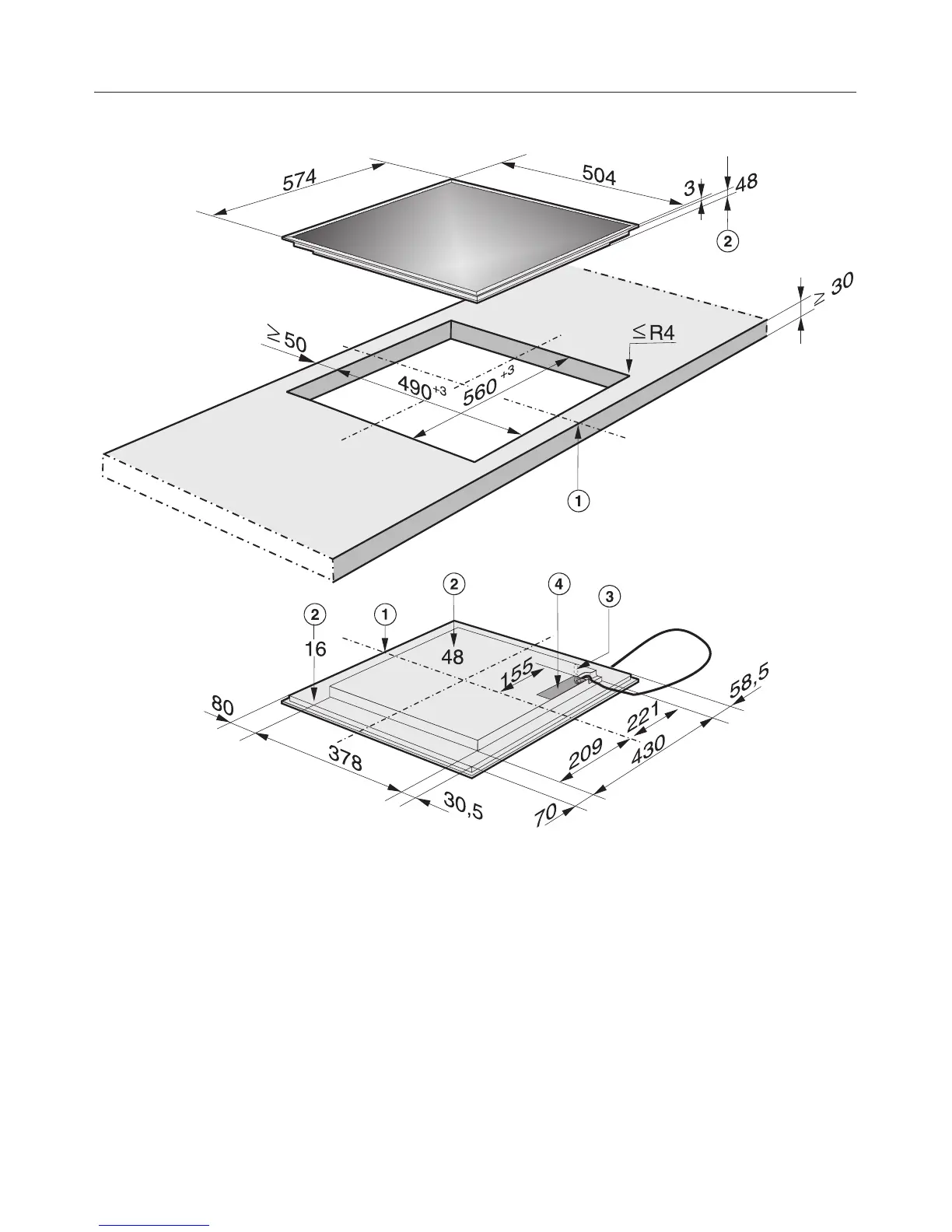 The mains connection cable (1440 mm long) is supplied separately.