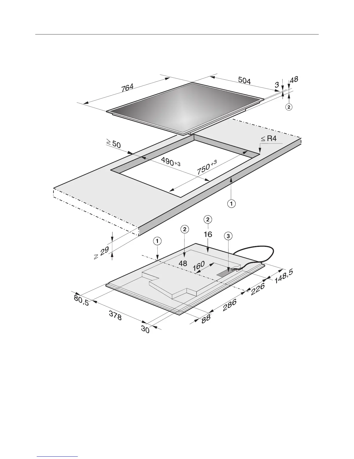The mains connection cable (1440 mm long) is supplied separately with the hob.