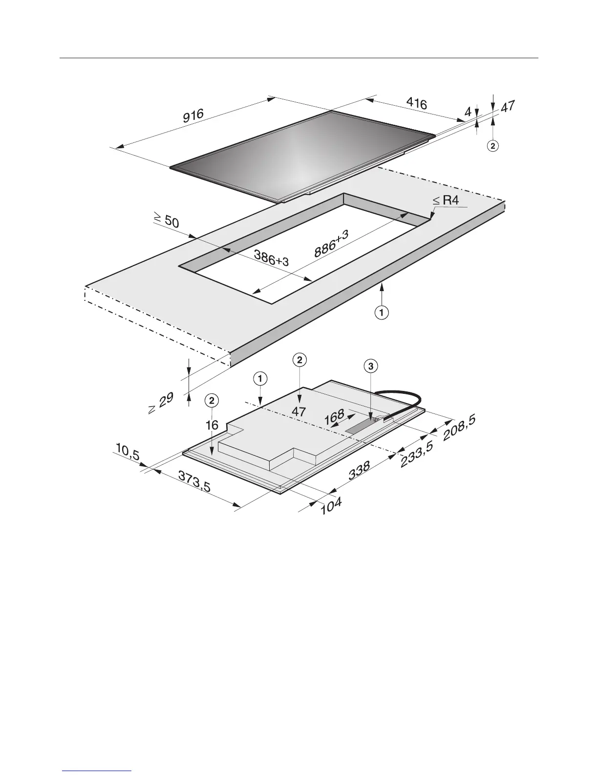 The mains connection cable (1440 mm long) is supplied separately with the hob.