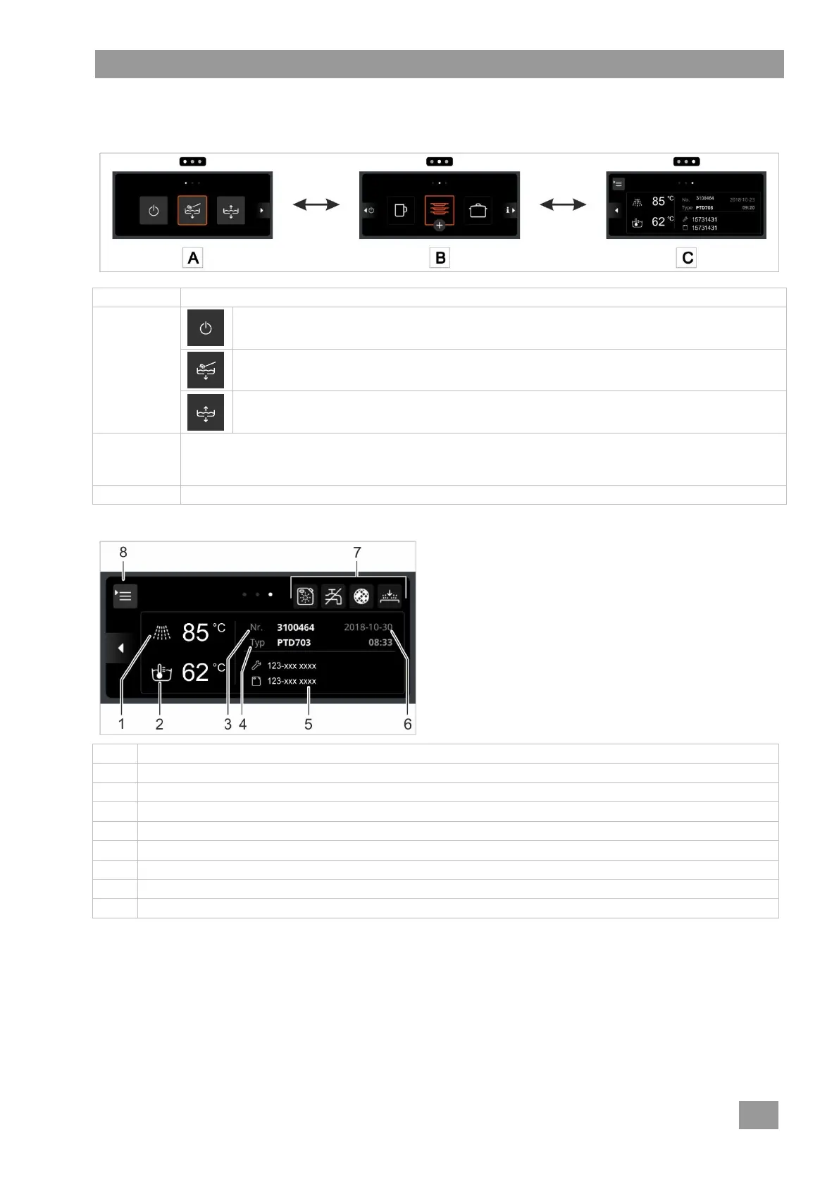 Het hoofdniveau wordt automatisch weergegeven met afb. B als het apparaat gereed is voor gebruik.
