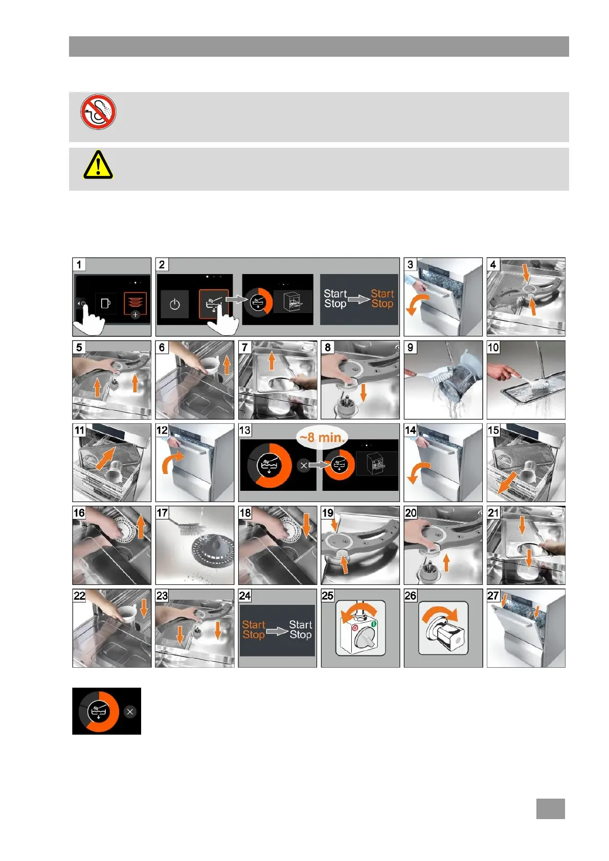 kroky. Pokud tyto pracovní kroky neprovedete, samočisticí program po 30 sekundách automaticky pokračuje.