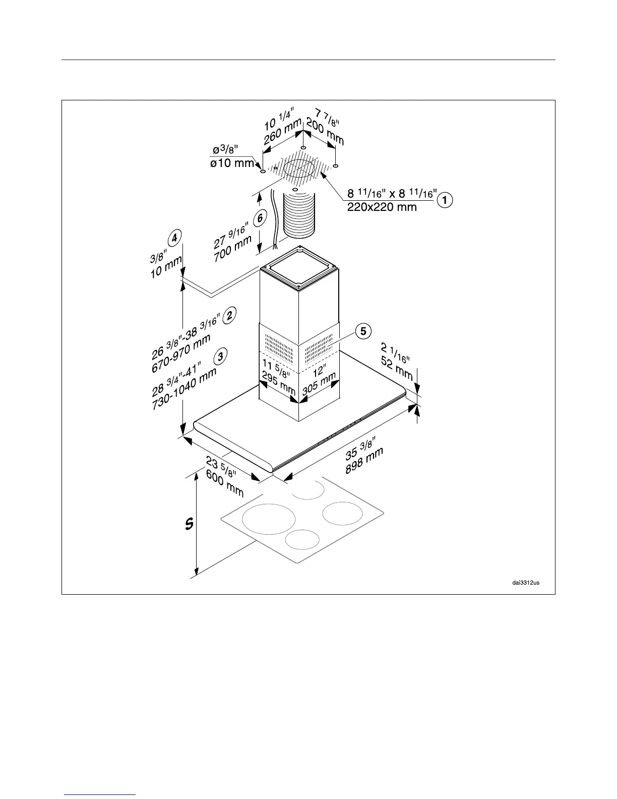 Possible height range for appliance in recirculation mode