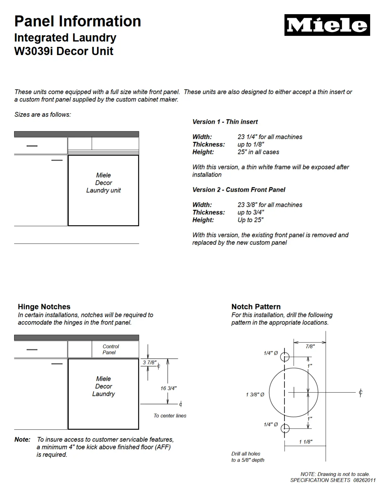 Miele W3035 - Panel Information: Integrated Laundry W3039 i; Thin Insert Panel Dimensions; Custom Front Panel Dimensions; Hinge Notches and Pattern