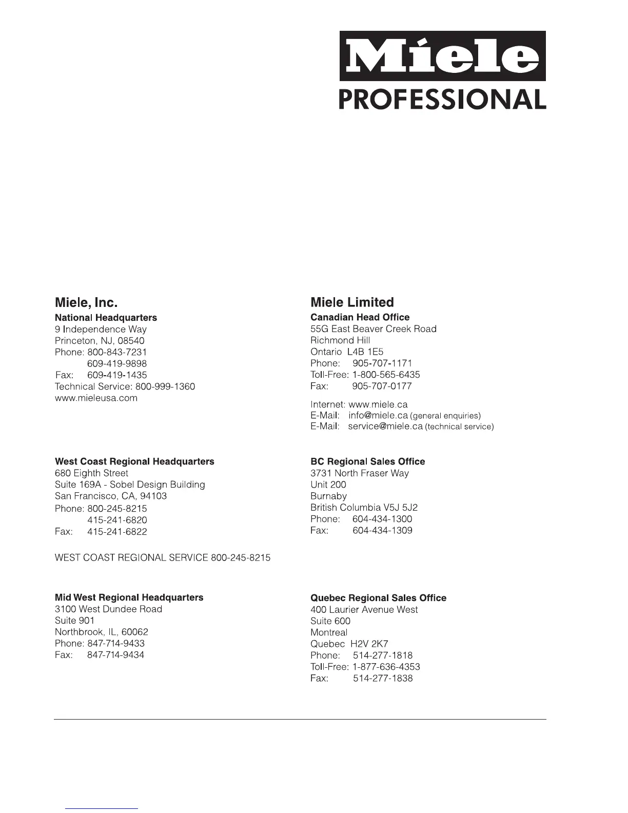 Miele WS 5101 - Miele Service and Contact Information; North American Headquarters and Service Contacts