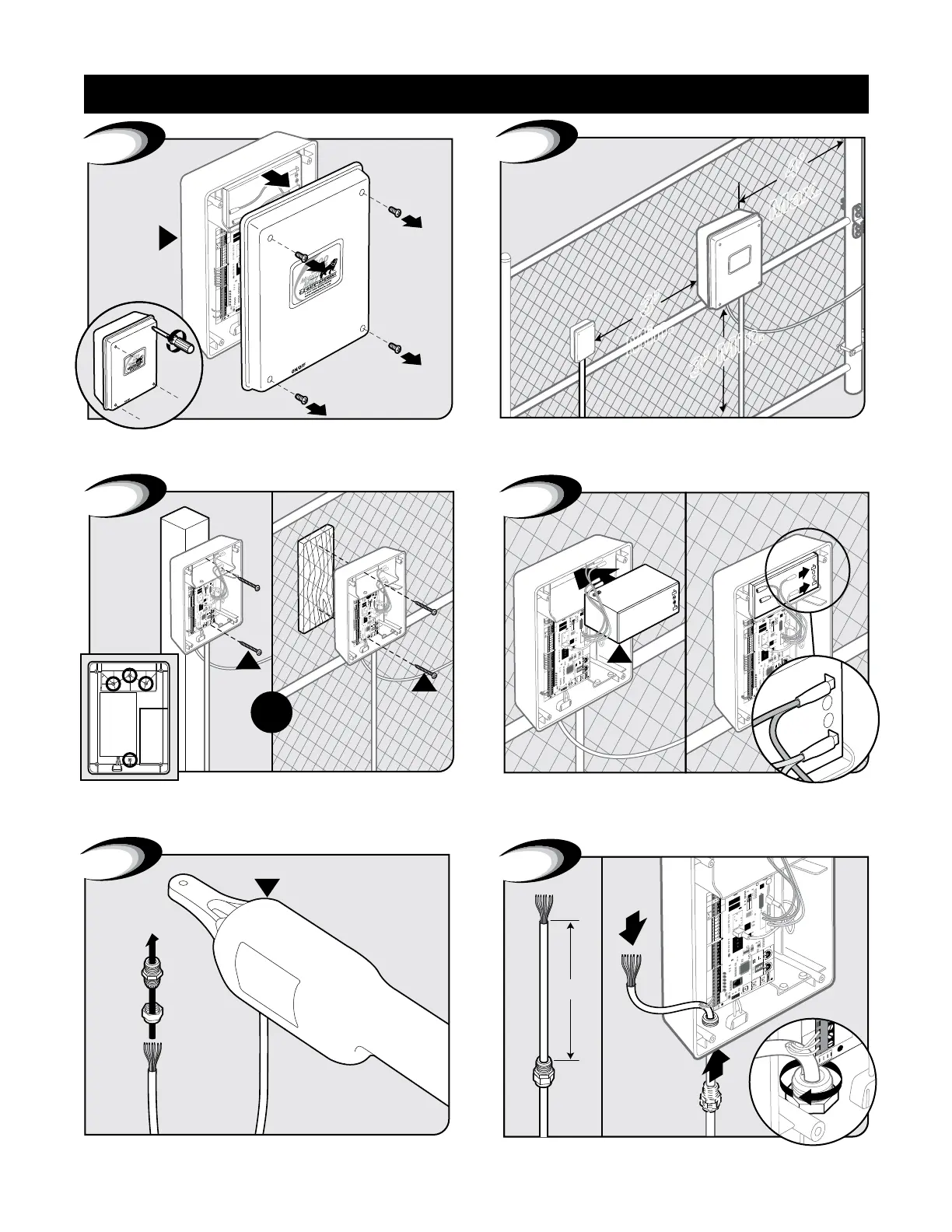 Mount control box to post or fence using screws. Position battery in control box as shown. Connect battery leads