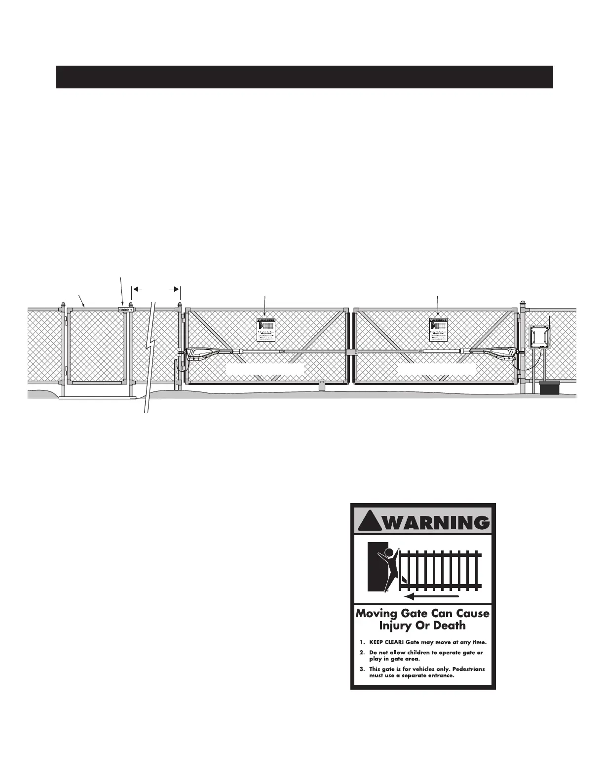Gate Operators. A minimum of two WARNING SIGNS must be installed in the area of the gate. Each sign is to be