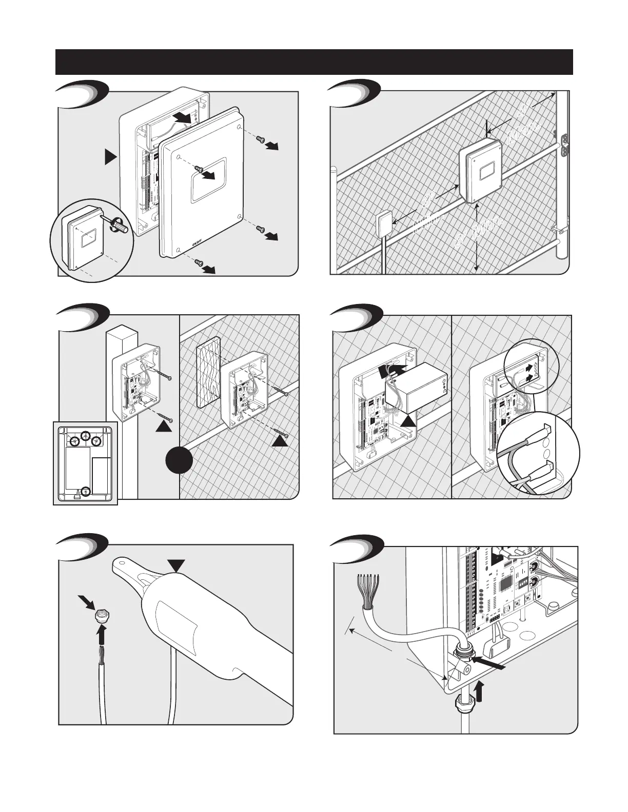 Mount control box to post or fence using screws.