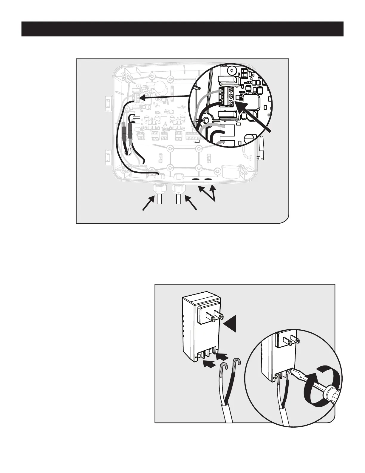 ● Feed the transformer or solar panel wires into the control box using one of the access locations on the bottom of the box.