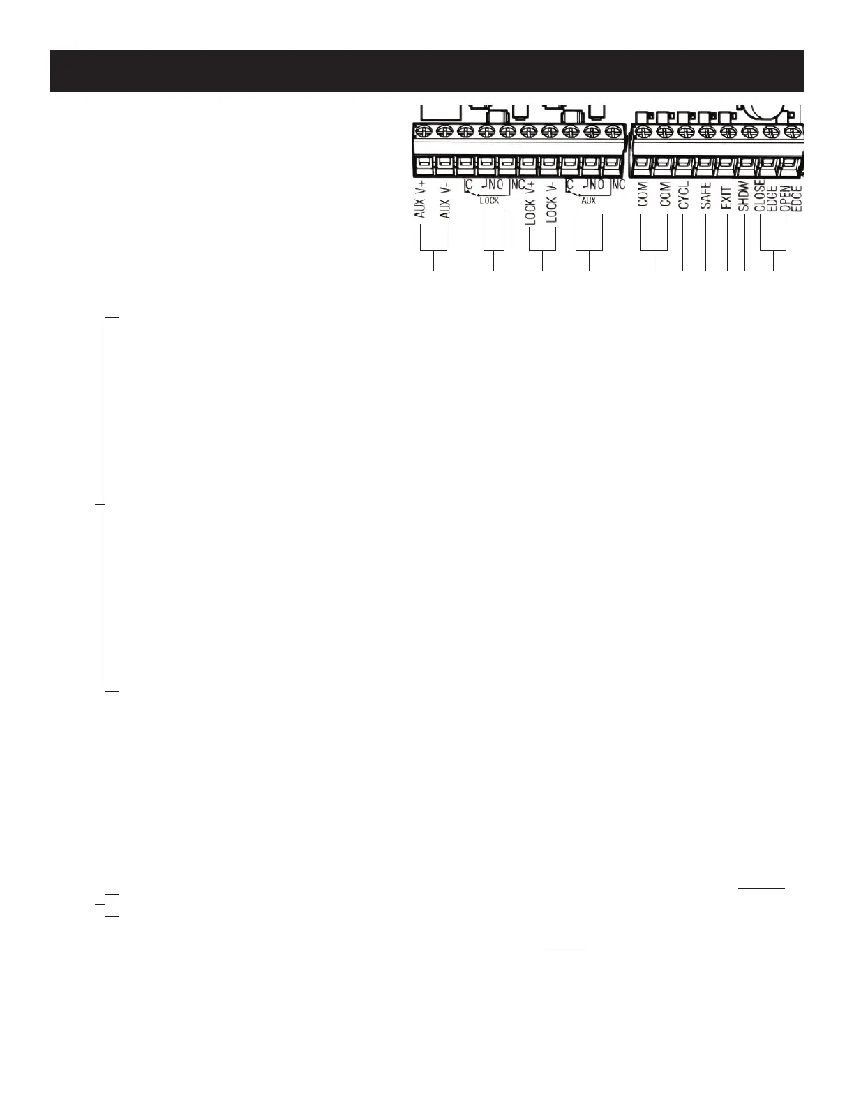 8 AUX C NO NC: The AUX Relay is triggered during gate operation and remains activated for the duration of the gate