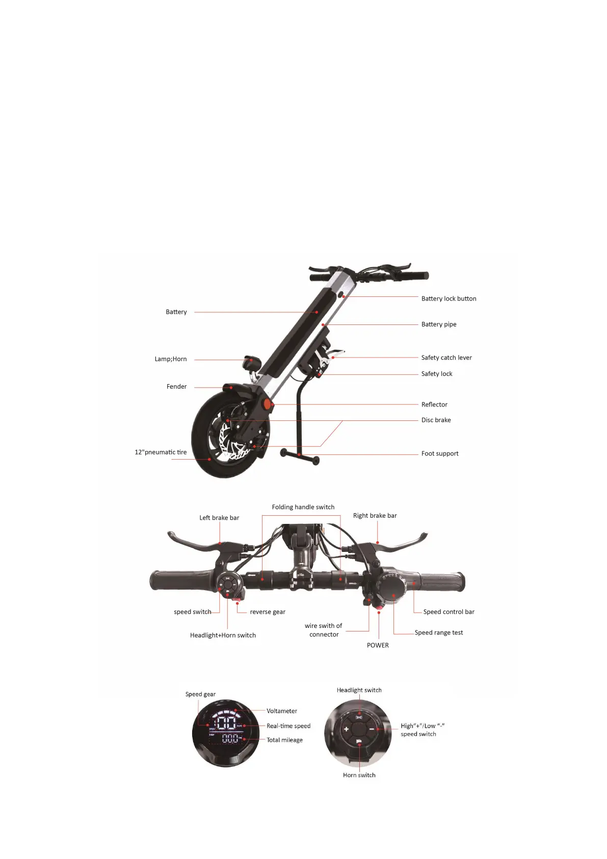 power switch, pneumatic tire, quick release pin,foot support, fender, reflectors, and