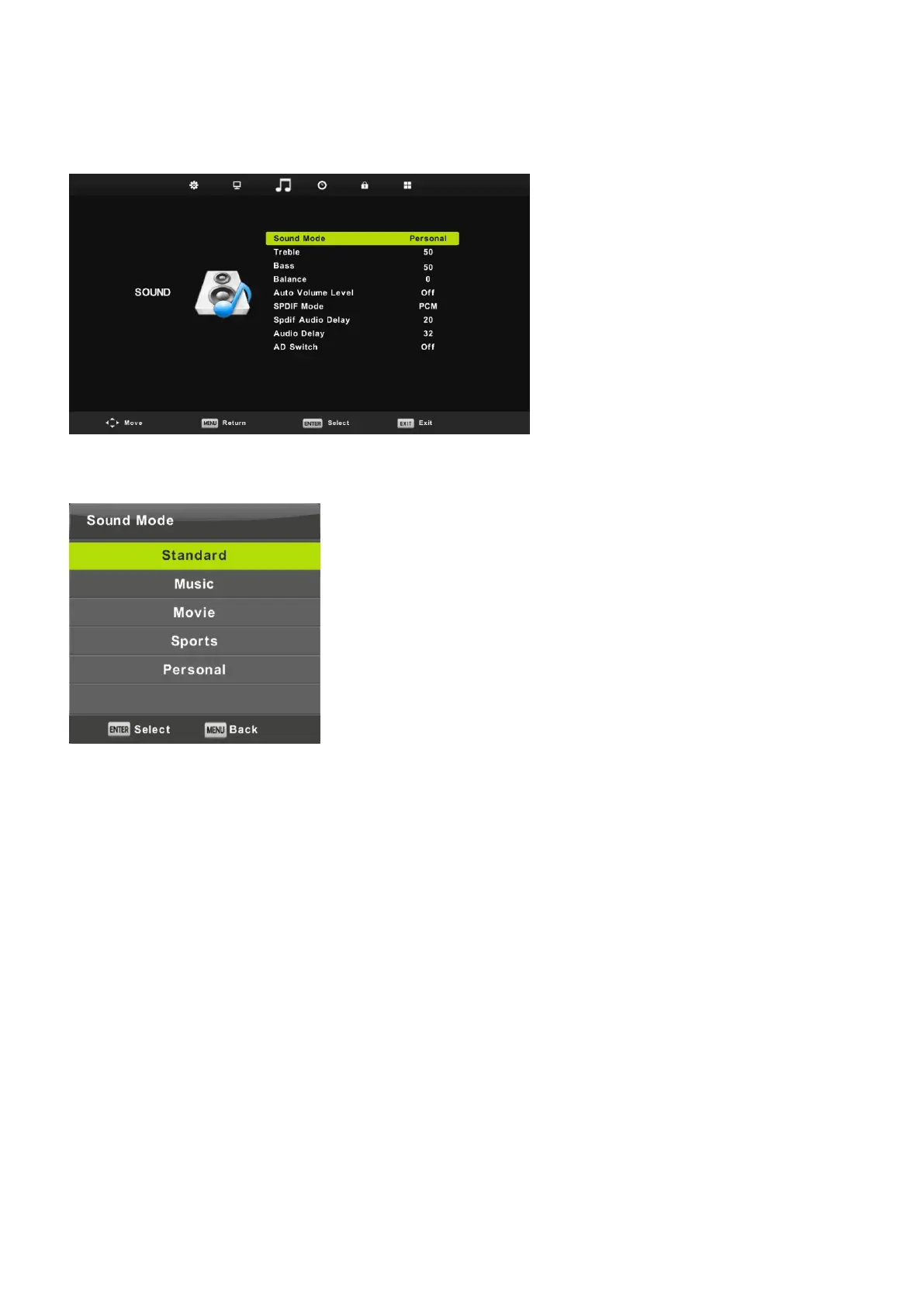 1. Press ▼ / ▲ button to select the option that you want to adjust in the SOUND menu.