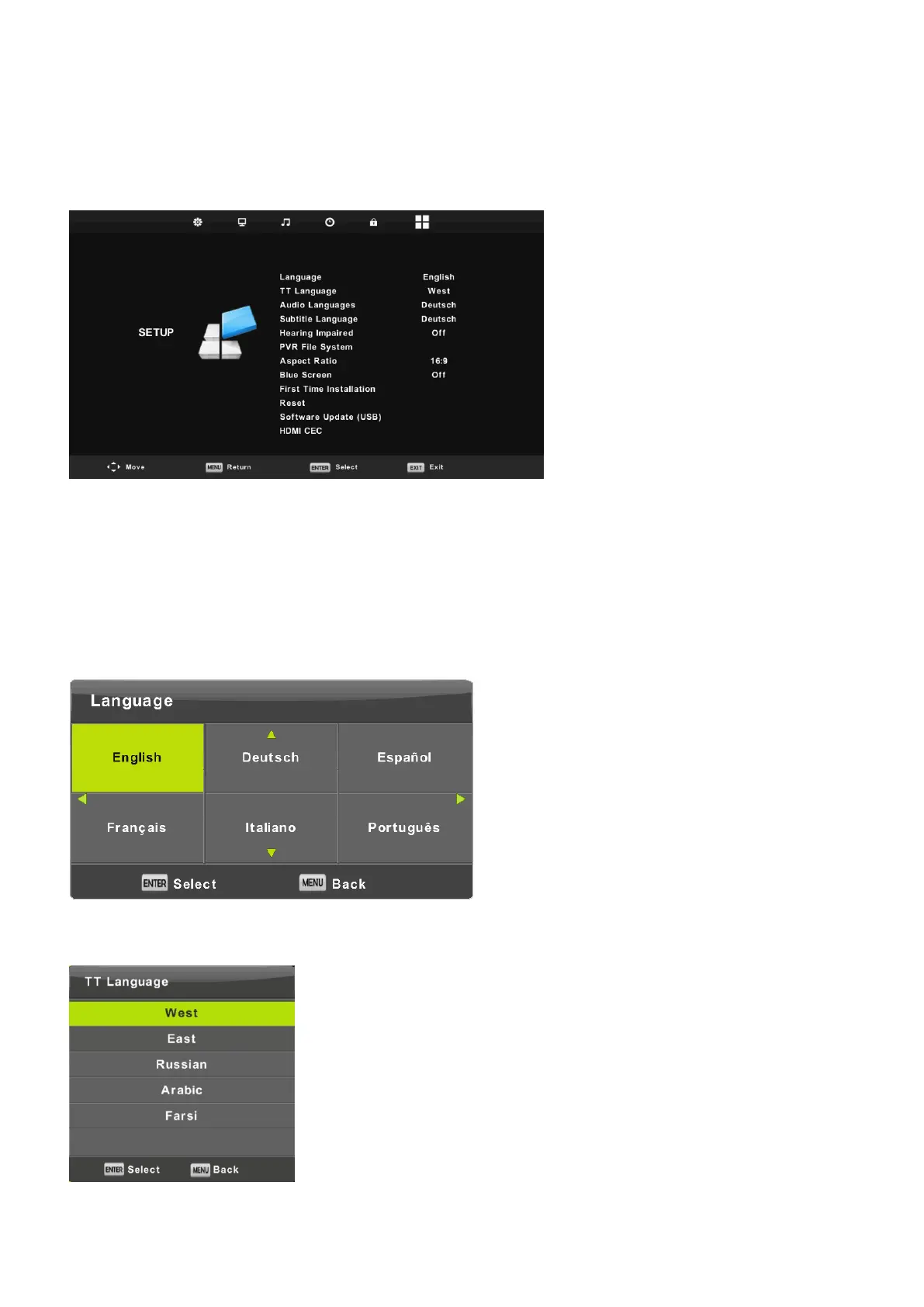 Press ▼ / ▲ button to select TT Language, then press Enter button to enter sub-menu.