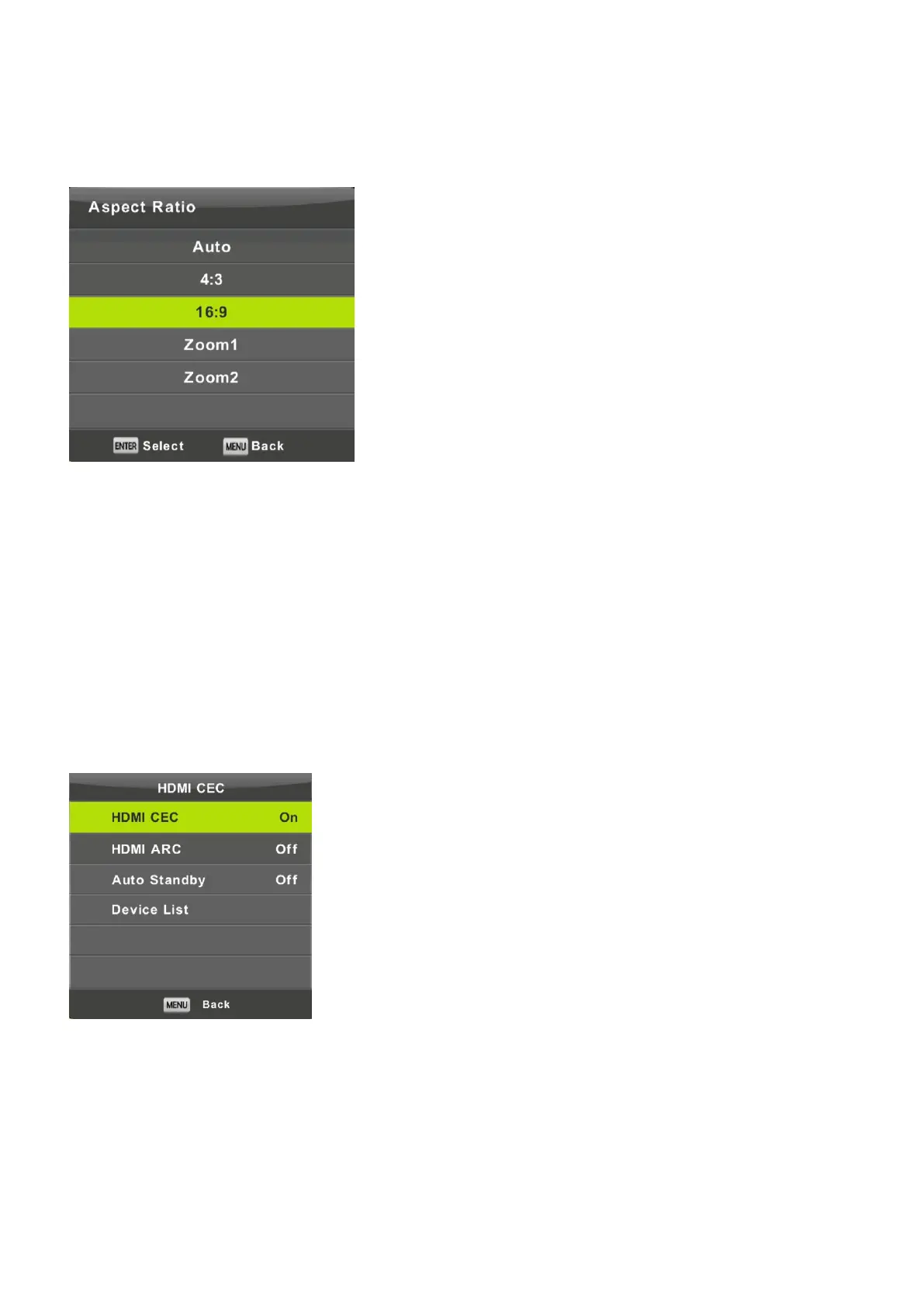 Press ▼ / ▲ button to select HDMI CEC, then press Enter button to enter the sub-menu.