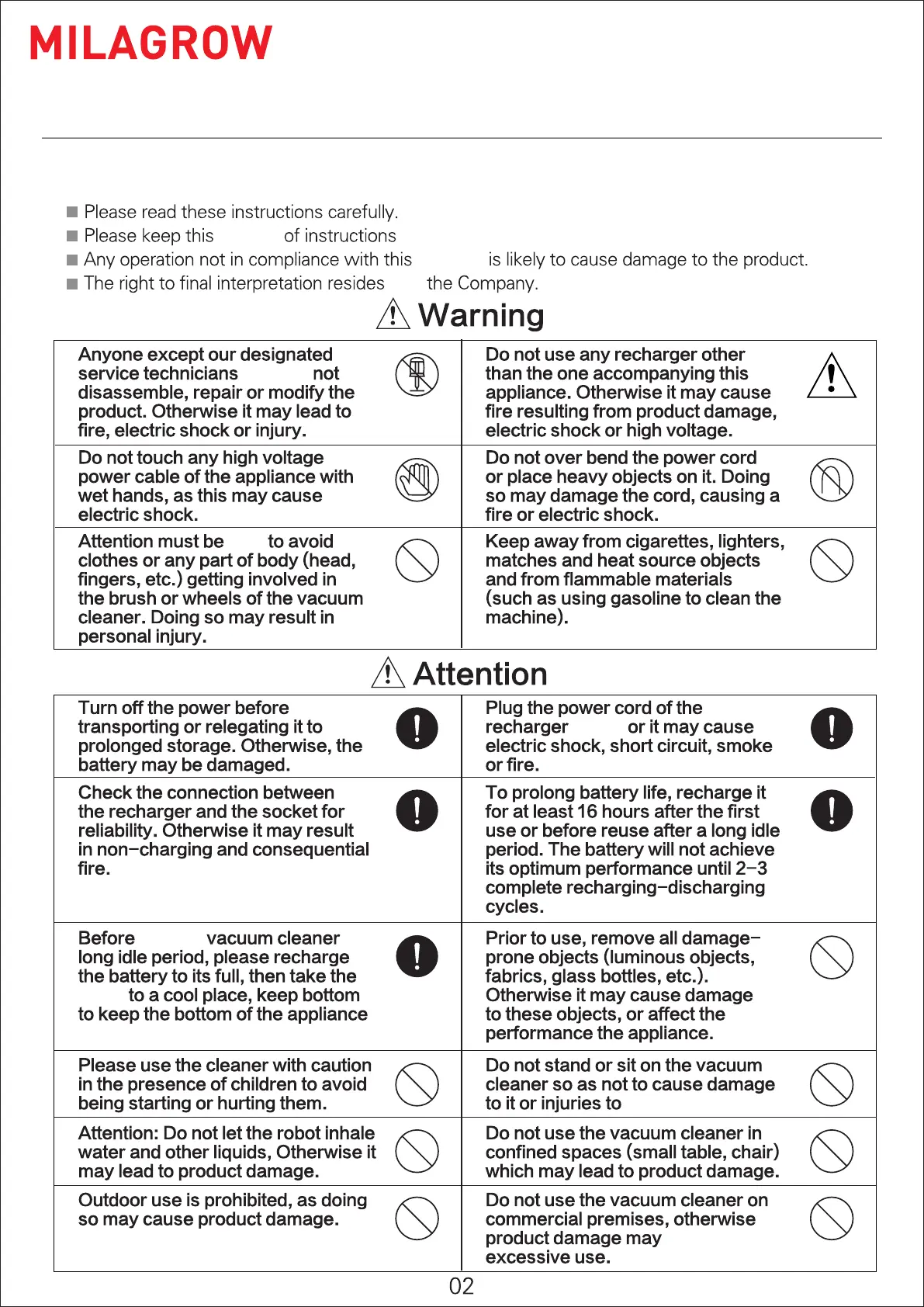 Milagrow Seagull - Safety Instructions; General Safety Warnings; Usage Precautions