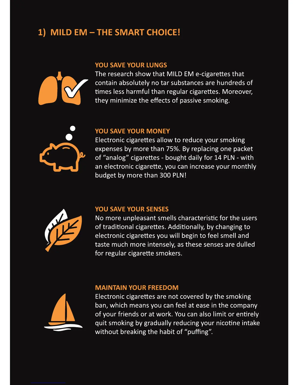 Mild EM - MILD EM: The Smart Choice; Health Benefits: Saving Your Lungs; Financial Benefits: Saving Your Money; Sensory Improvements: Saving Your Senses