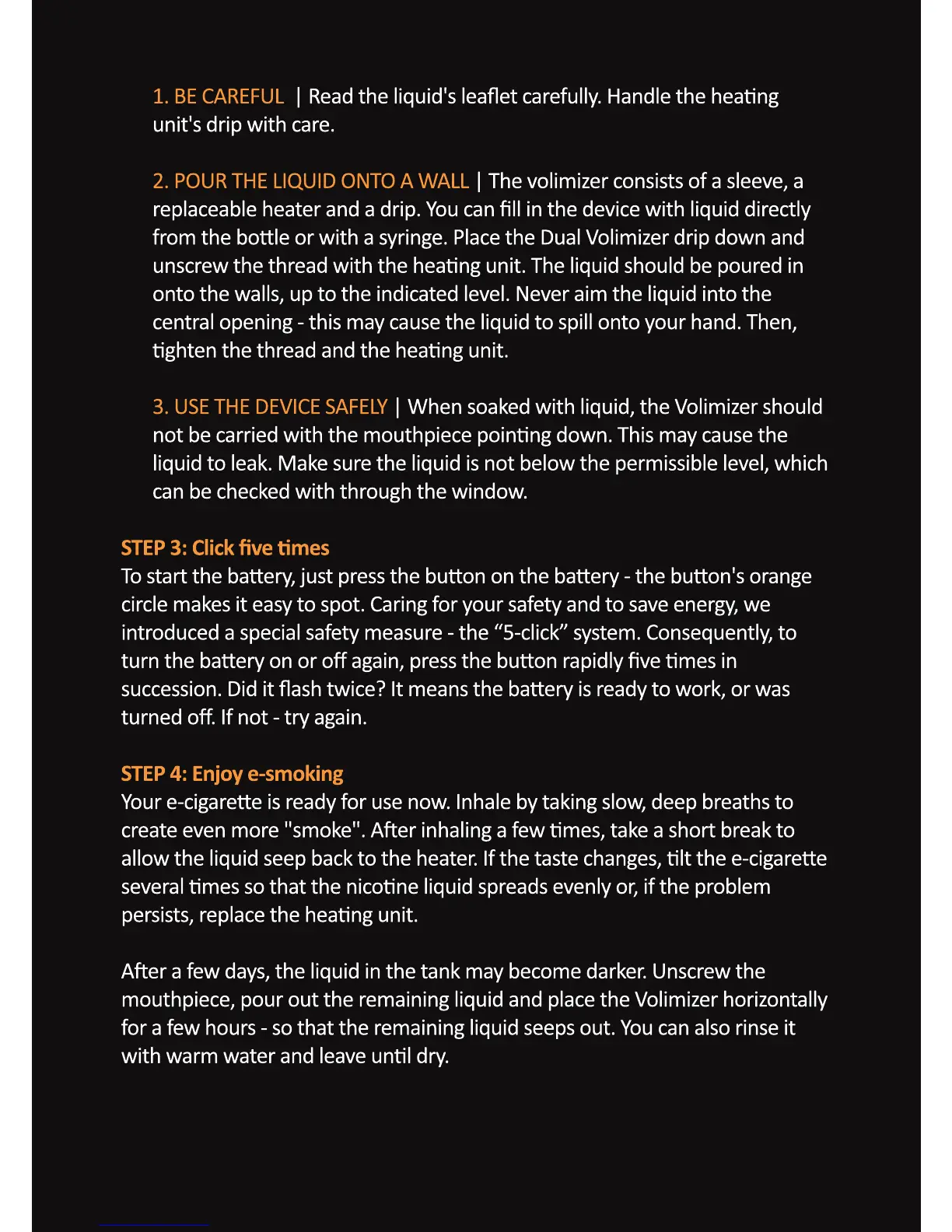 Mild EM - Step 2 Details: Pouring Liquid Safely; Step 3: Activate Device (5-Click System); Step 4: Enjoy E-smoking