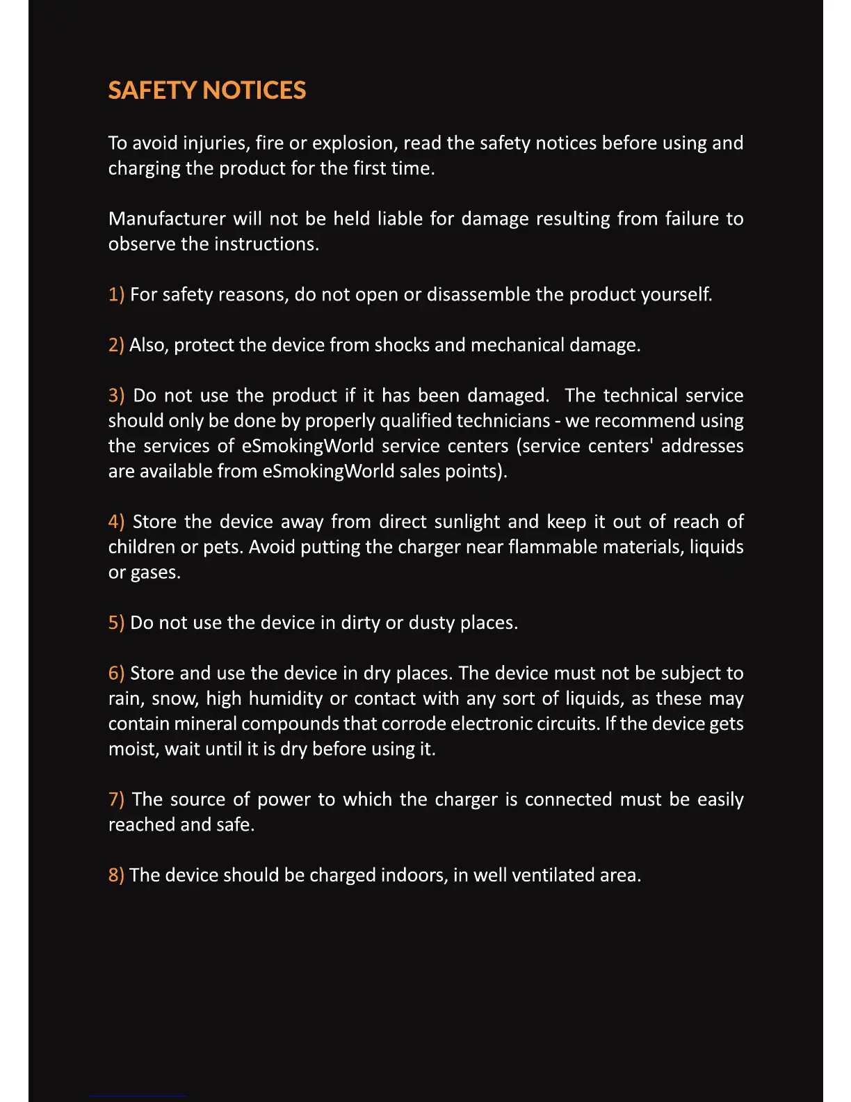 Mild EM - Safety Notices; General Device Safety; Storage and Environment Safety; Charging Power Source Safety