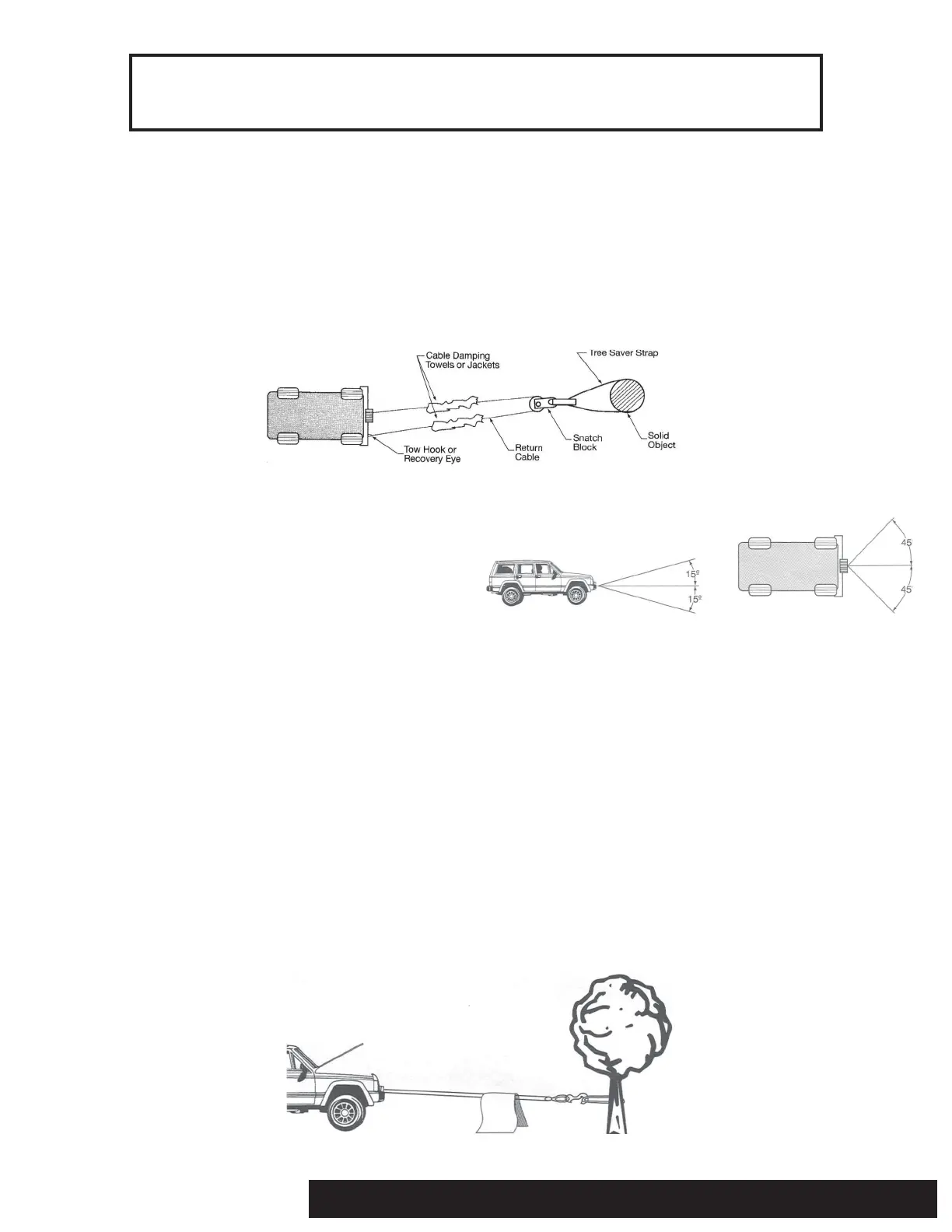 Attach return cable to tow hook or recovery eye when using a snatch block. Always use a clevis to secure snatch block to strap, or severe