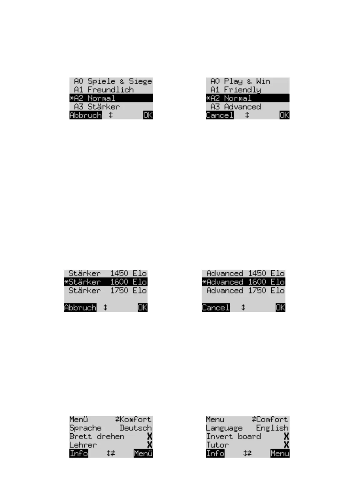 Here, the * shows that the computer is currently set to play on level A2. By means of the ñ / ò buttons, any