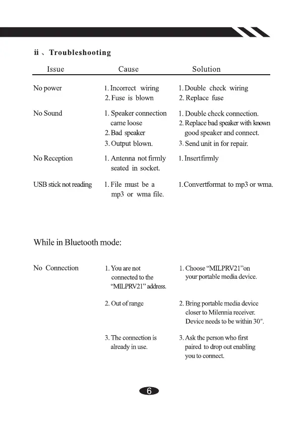 Milennia PRV21 - Troubleshooting Common Issues; No Power or Intermittent Power; No Sound or Poor Audio Quality; Reception Problems