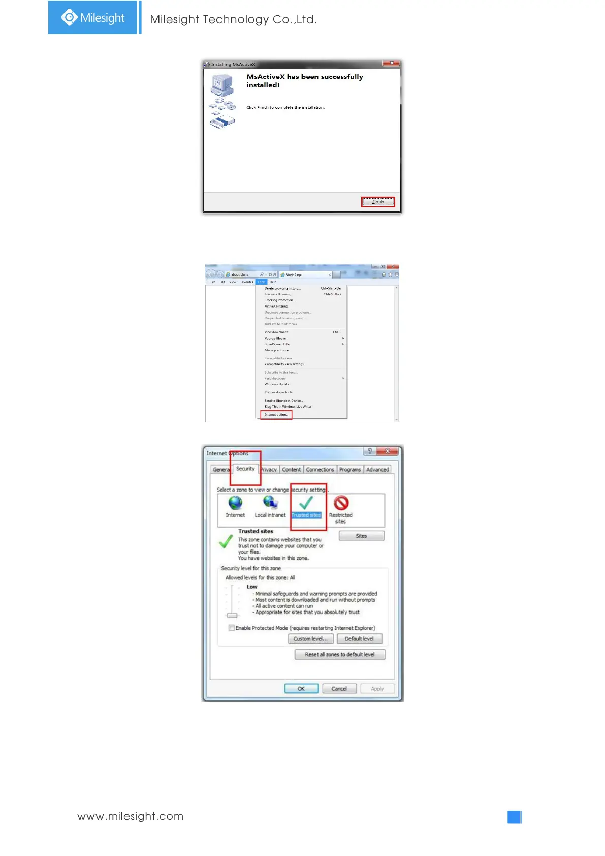 If IE9 or higher version browser is used, it is suggested that the Milesight camera web link should