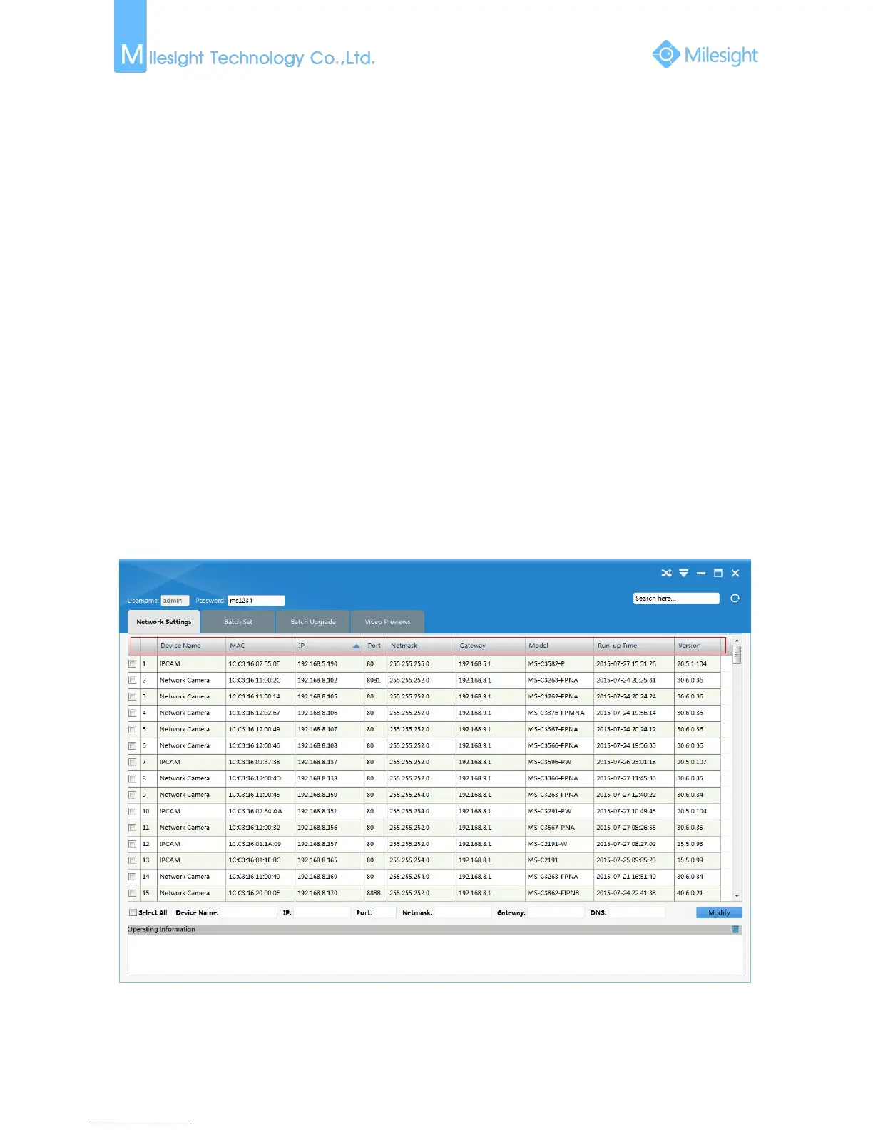 Netmask, and Gateway of all Milesight network cameras will be displayed. Details are