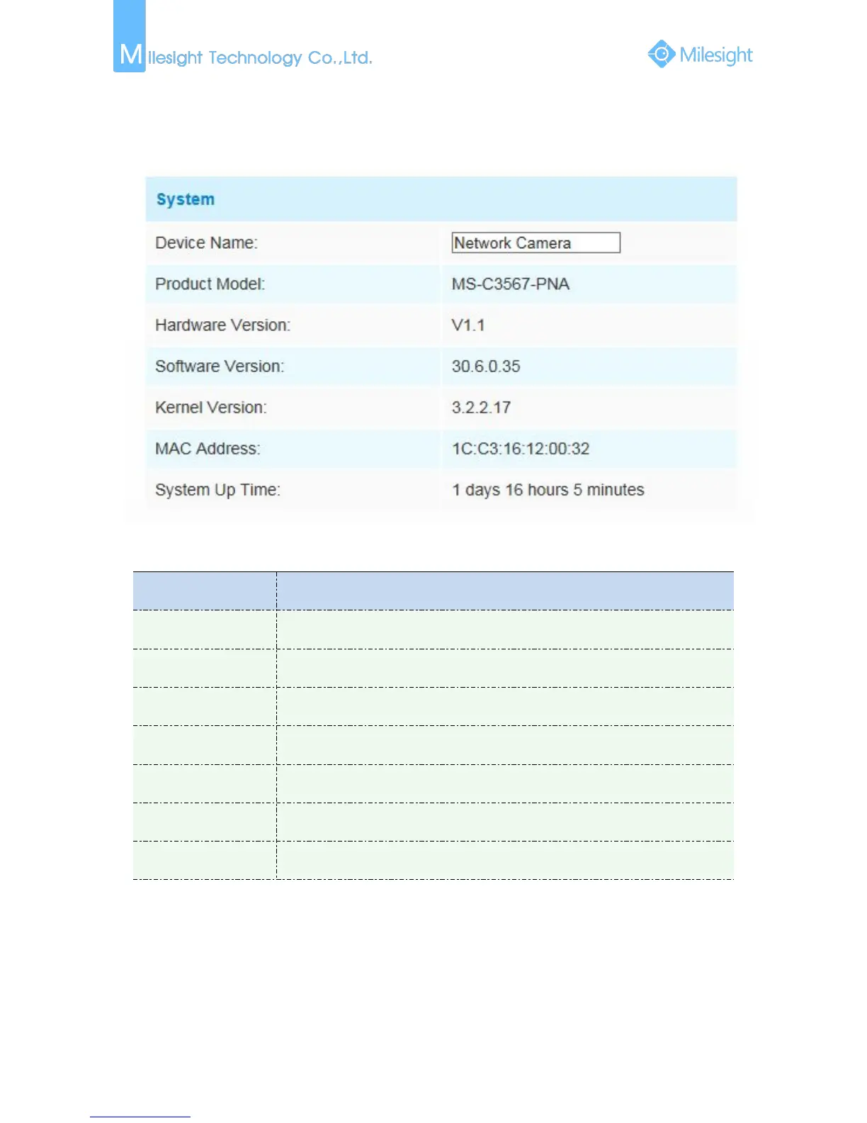 All information about the hardware and software of the camera can be checked on this page.