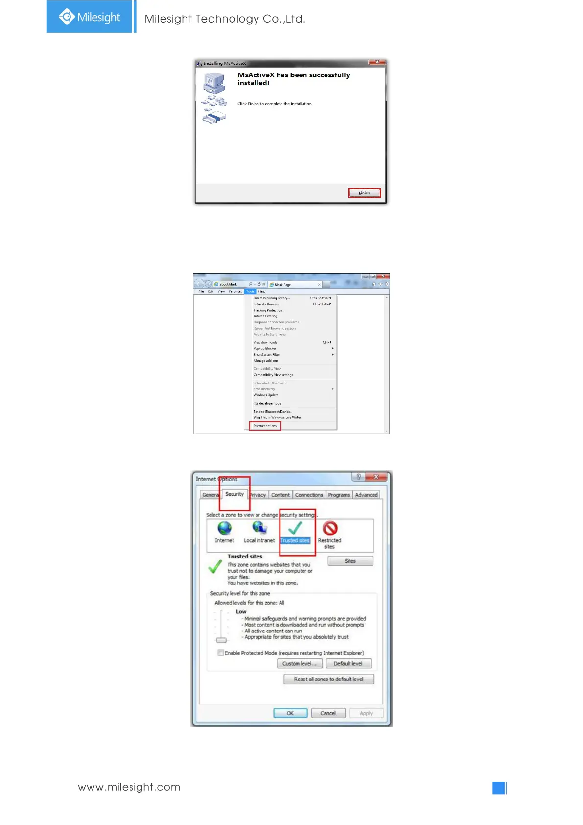If IE9 or higher version browser is used, it is suggested that the Milesight camera web link should