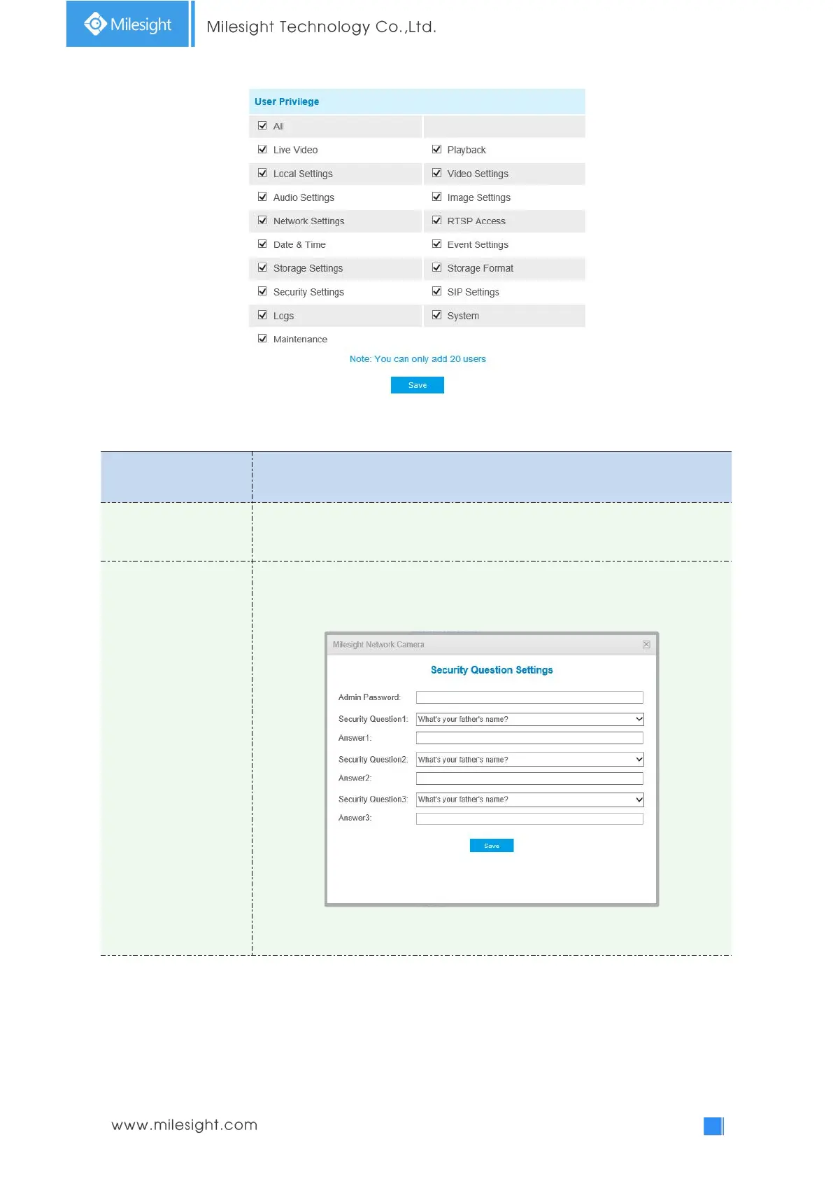 Click “Edit button to set three security questions for your camera. In case that