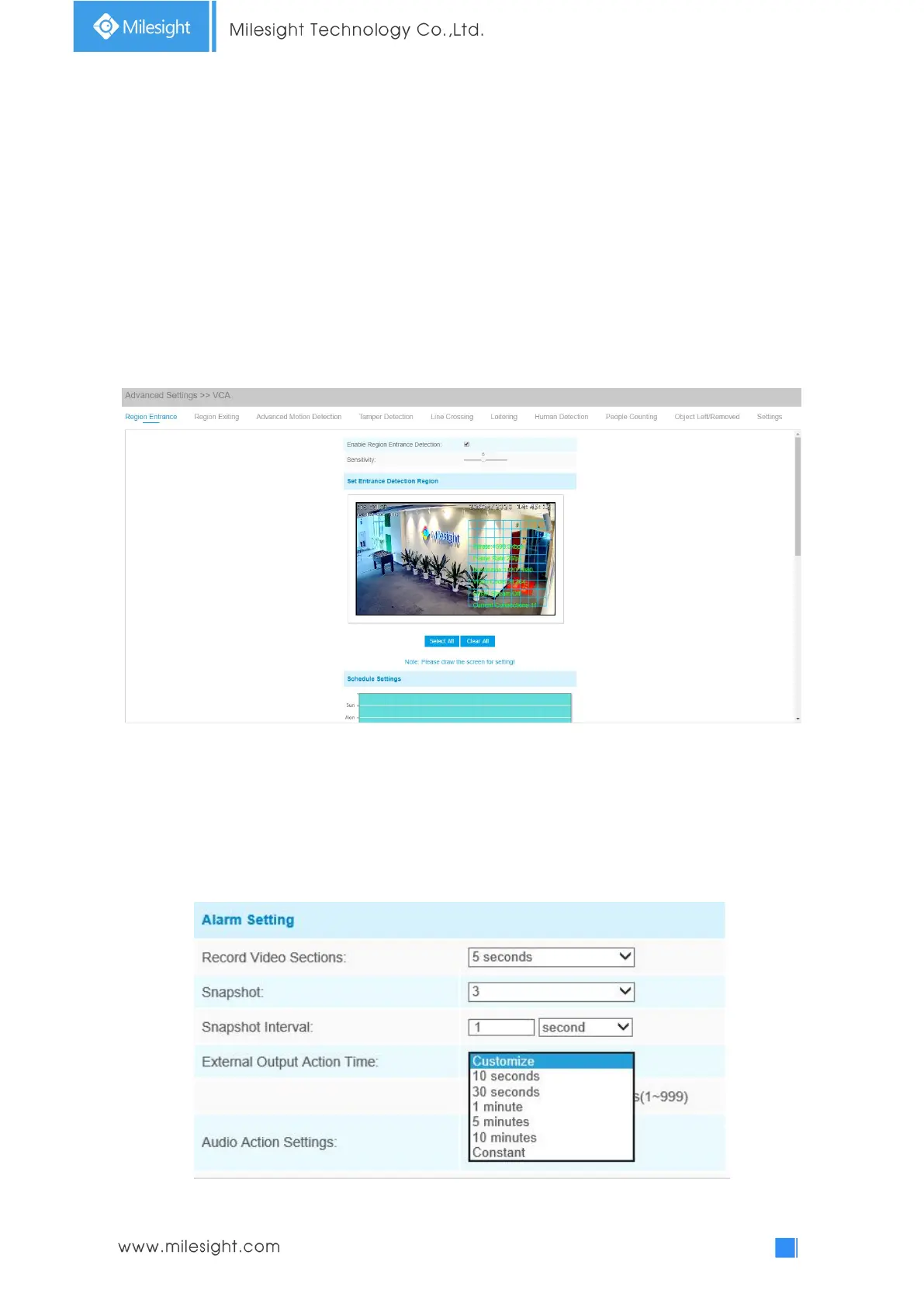 Action Time, when objects enter the selected regions, External Output Action alarm time will be
