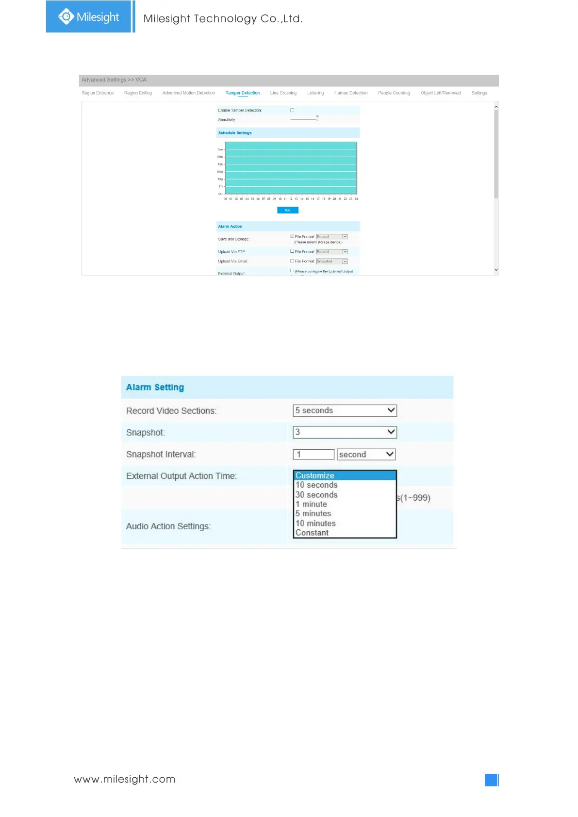 Action Time, when possible tampering is detected, External Output Action alarm time will be